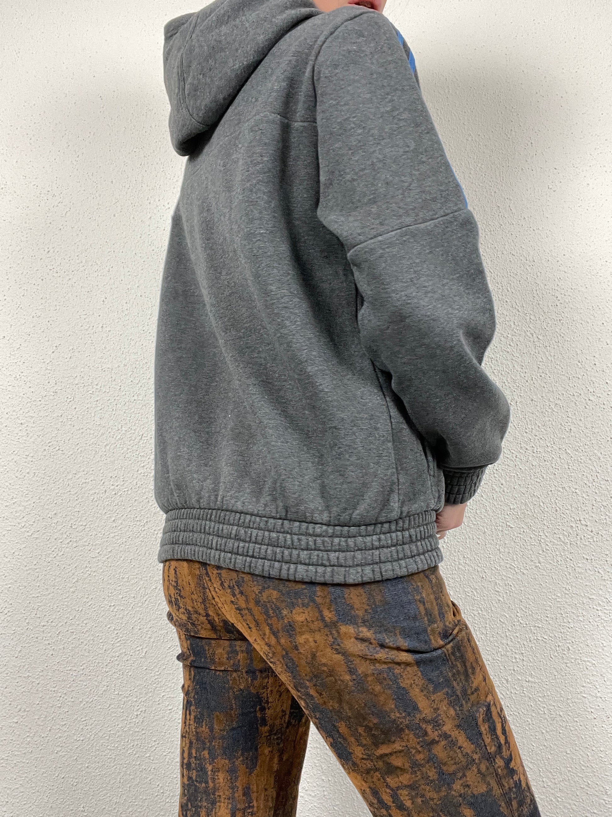 Grey hoodie with blue logo accents and signature three stripes on the sleeves. Soft and warm with a brushed fleece interior. Year: 2015.