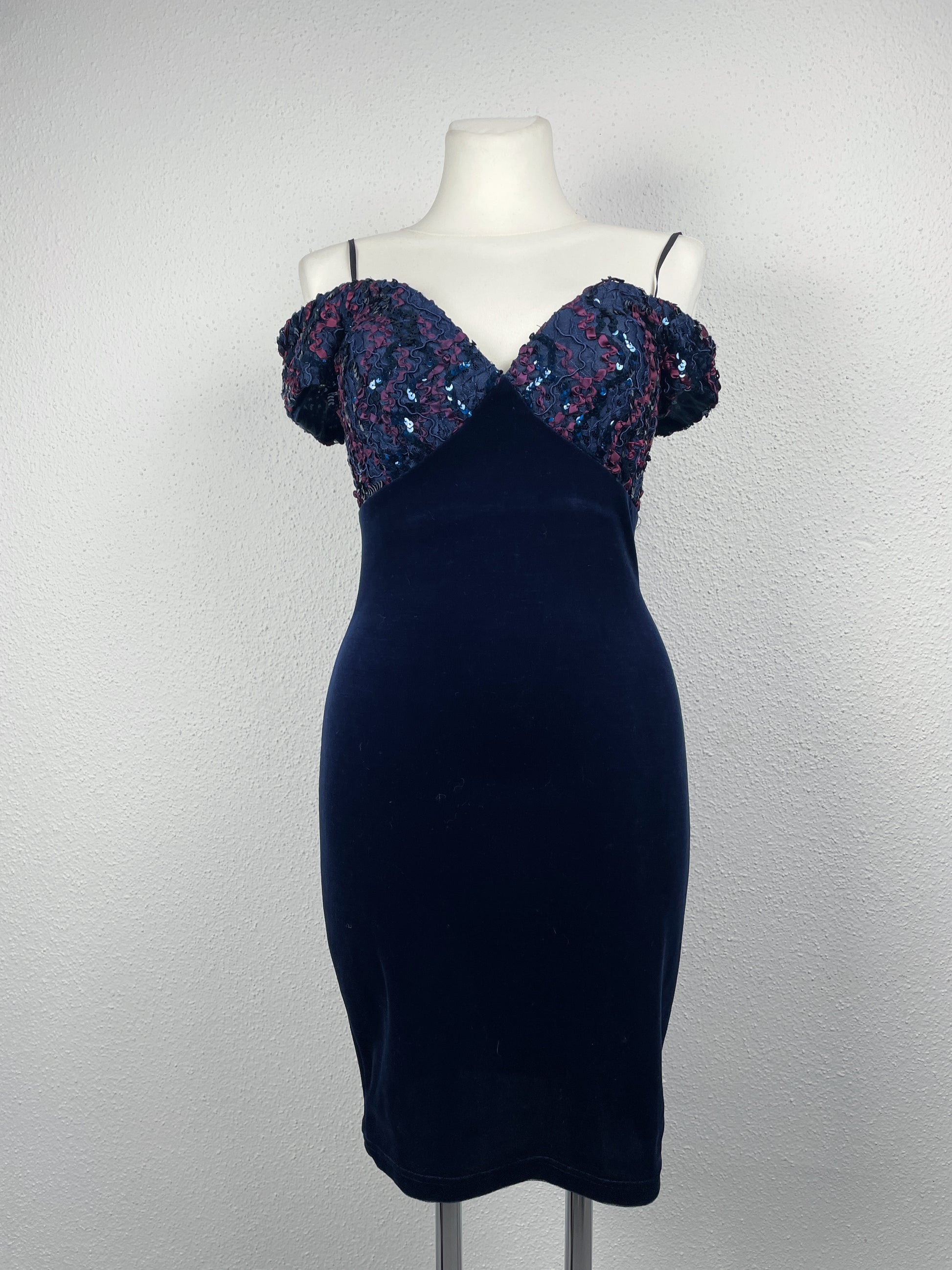 Deep navy velvet bodycon silhouette with an ornate sweetheart bodice, layered lace, ruched ribbon details and shimmering sequins. Off-shoulder draped sleeves and thin straps create a dramatic, glamorous evening look — a true iconic late-80s / early-90s party piece.