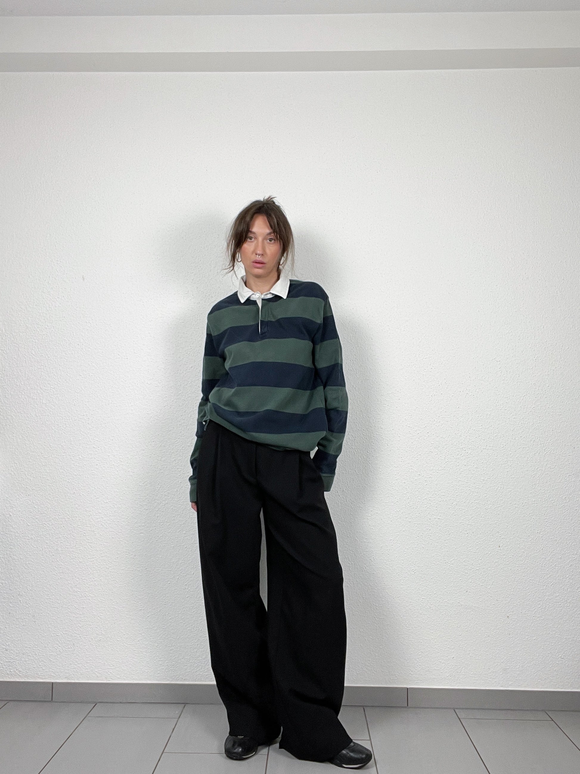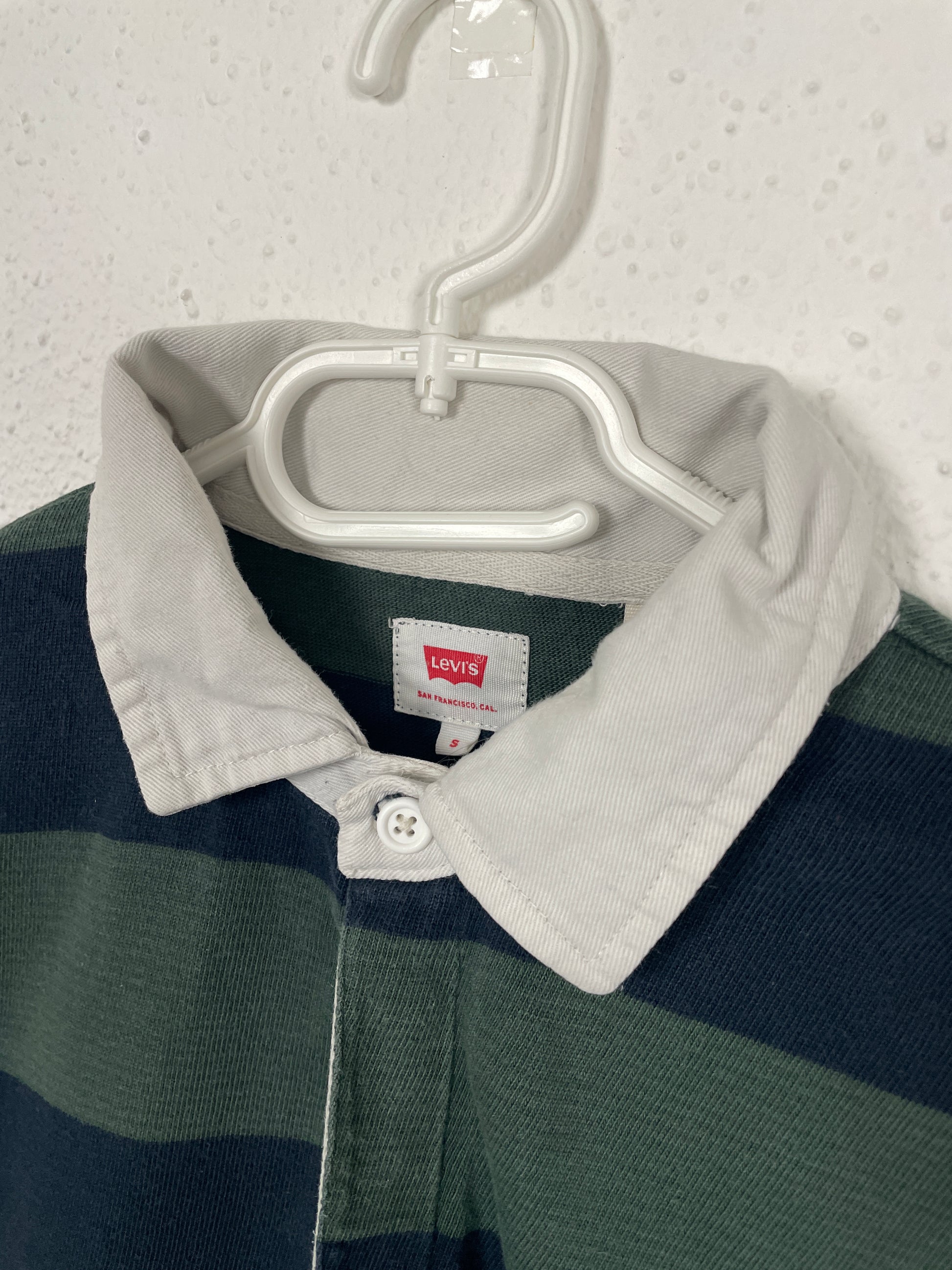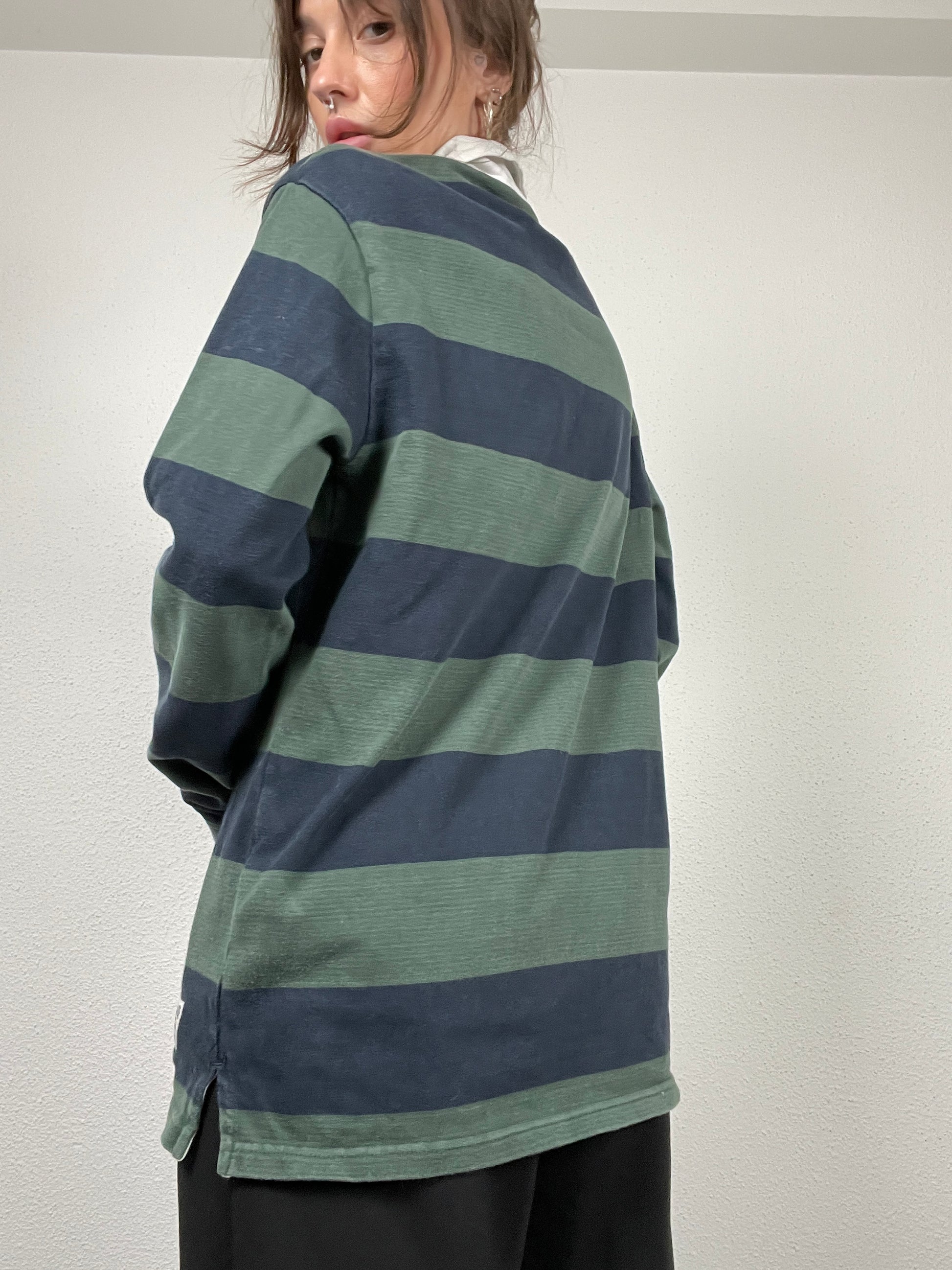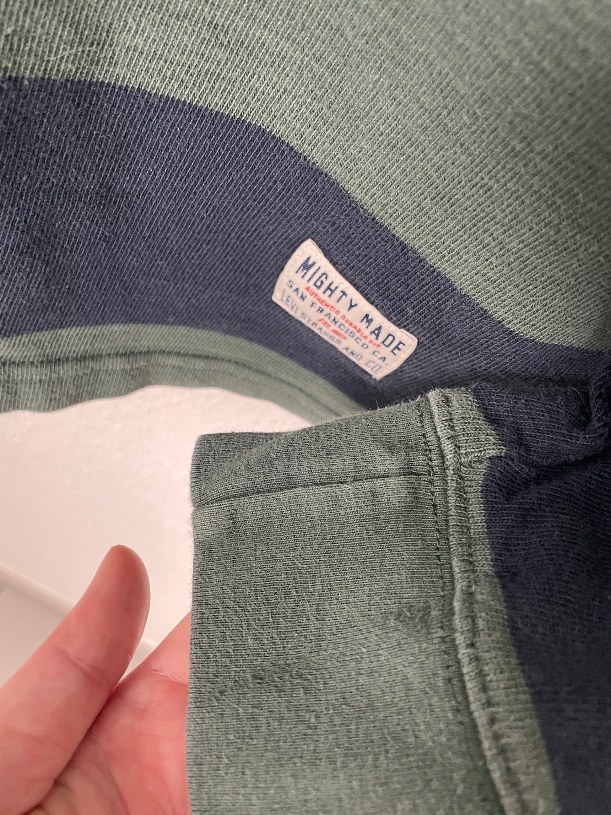 Vintage Levi’s rugby polo from the Mighty Made line. Thick cotton knit with bold forest green and navy stripes, contrasting white twill collar and button placket. Relaxed, slightly boxy fit — perfect worn loose or layered over a turtleneck.