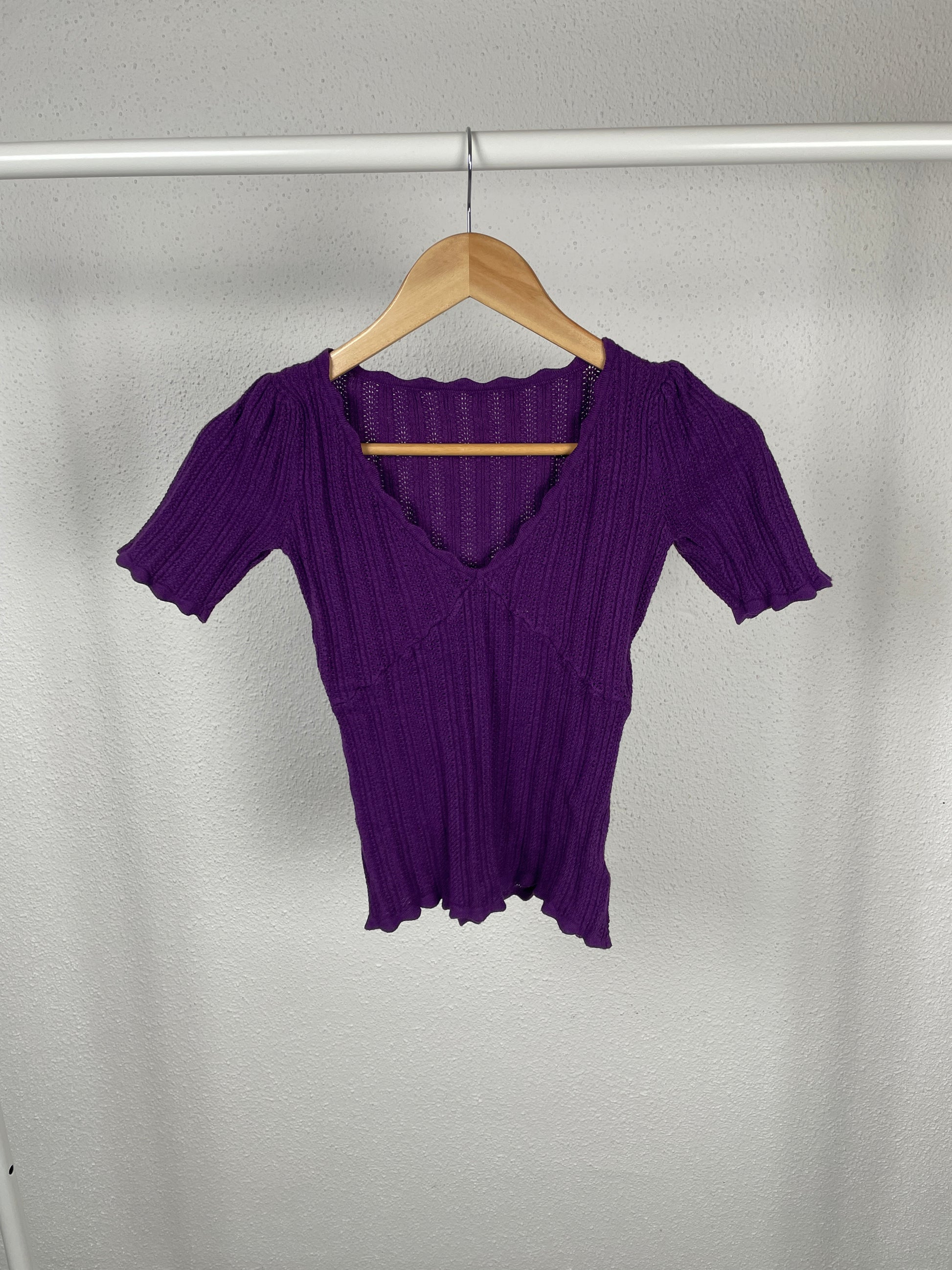 Cute fitted rib-knit top in a rich purple shade with a scalloped V-neckline and short sleeves. Soft, stretchy and flattering — a perfect Y2K piece.