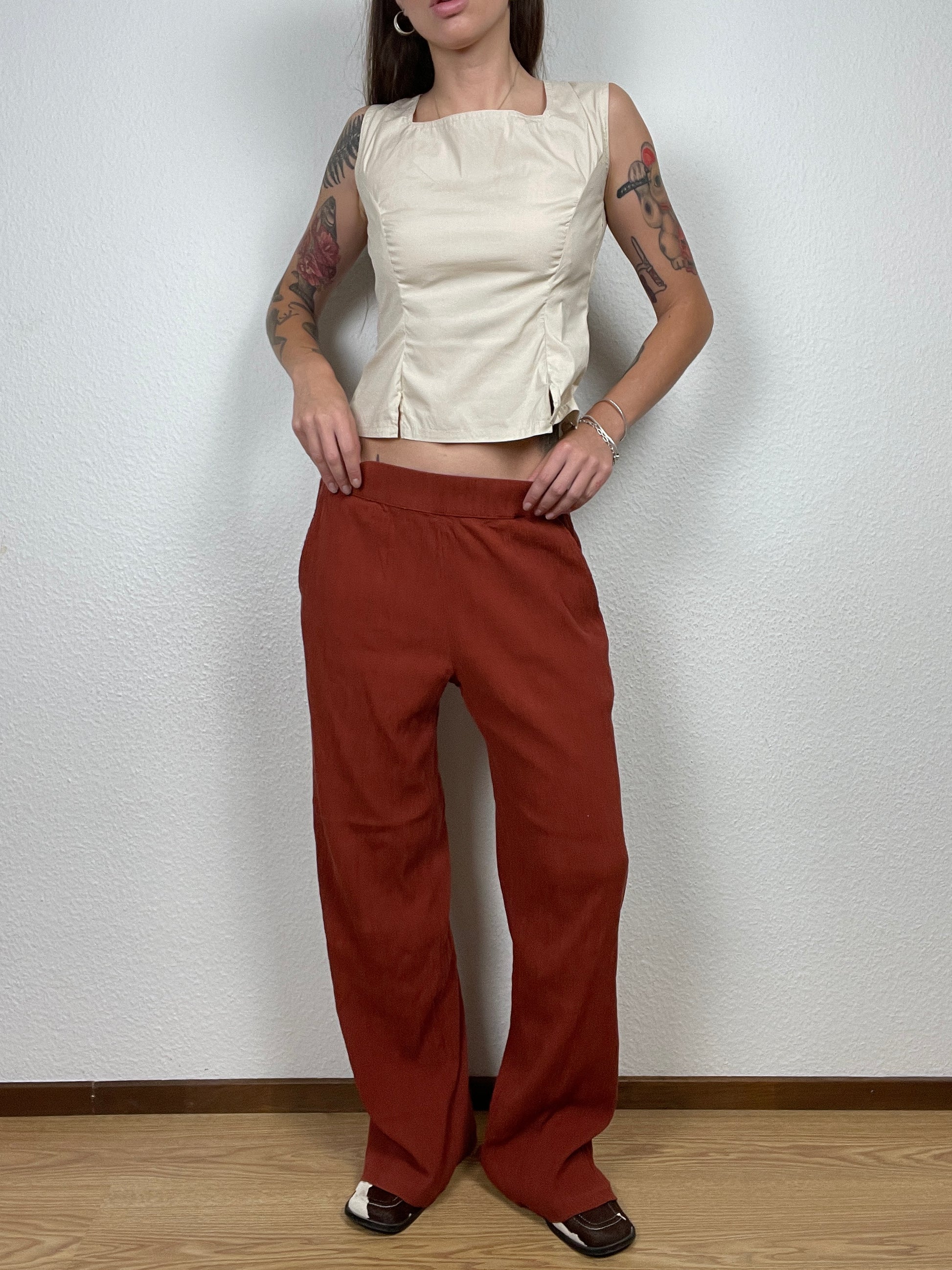 These relaxed-fit pants come in a warm rust tone with a subtle textured finish. Designed with an elastic waistband, they offer both comfort and versatility. The wide-leg cut makes them perfect for casual everyday wear or styling up with a sleek top.