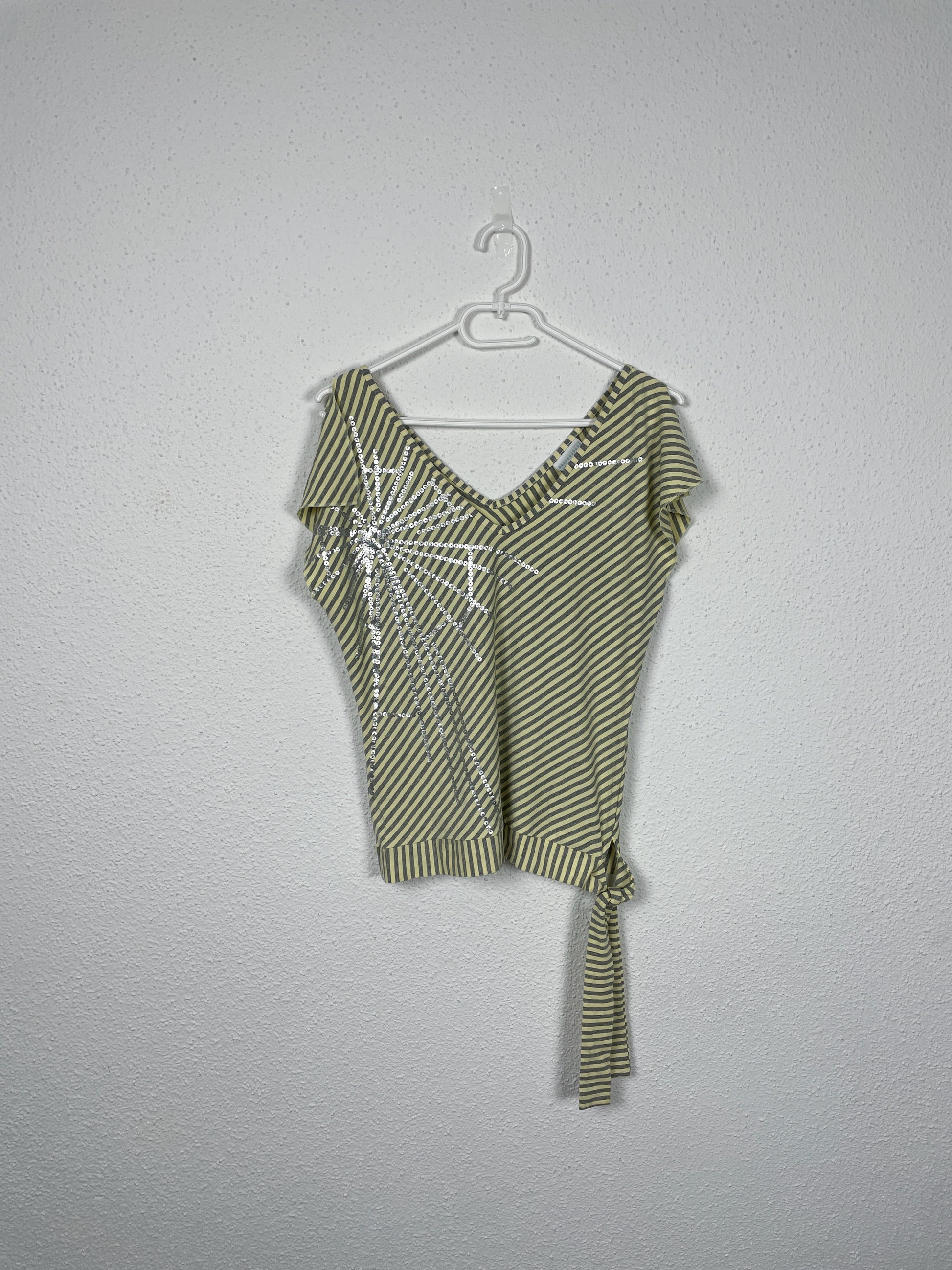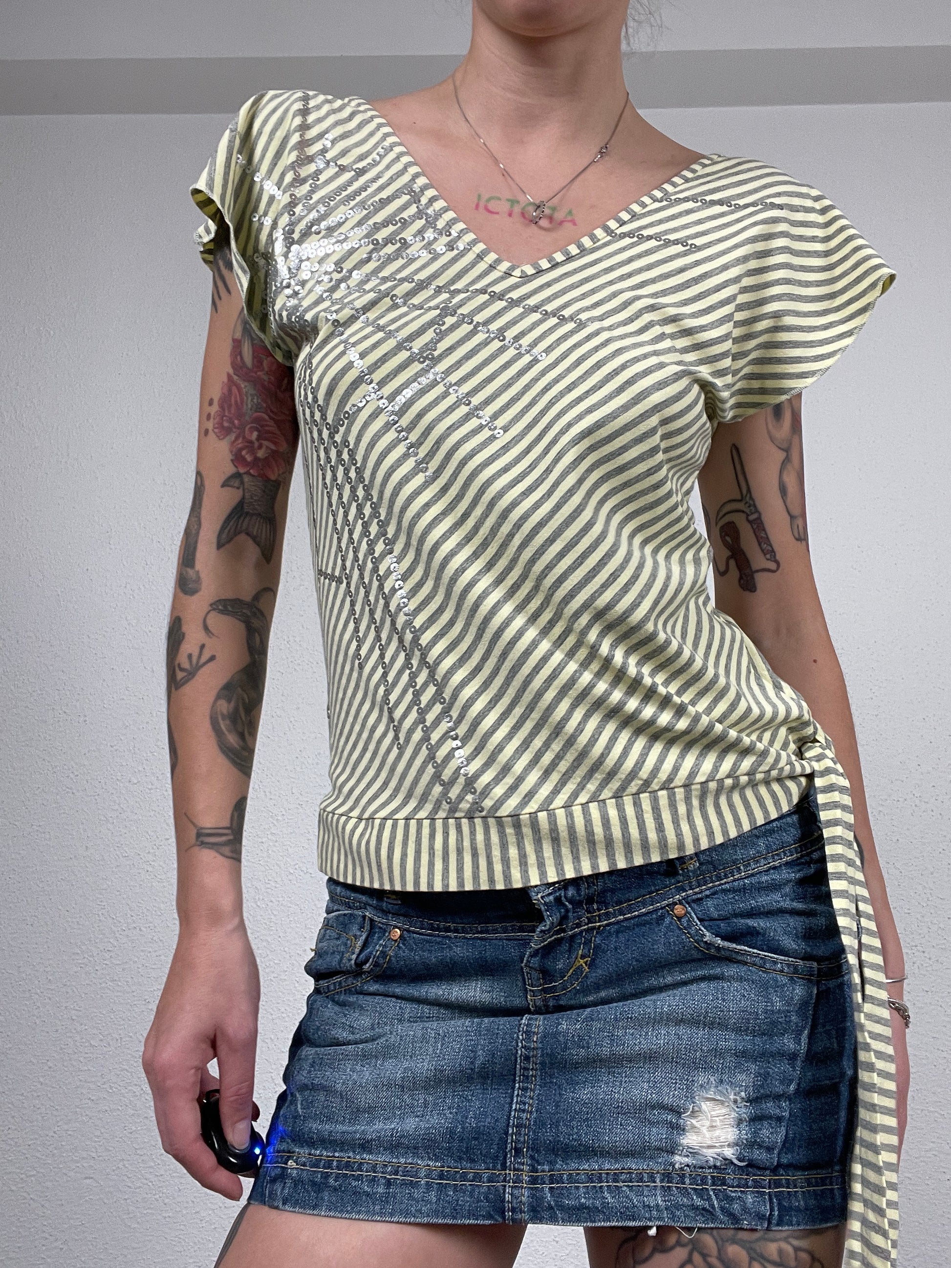 Vintage early 2000s yellow & grey striped sequin wrap top by Amaranto