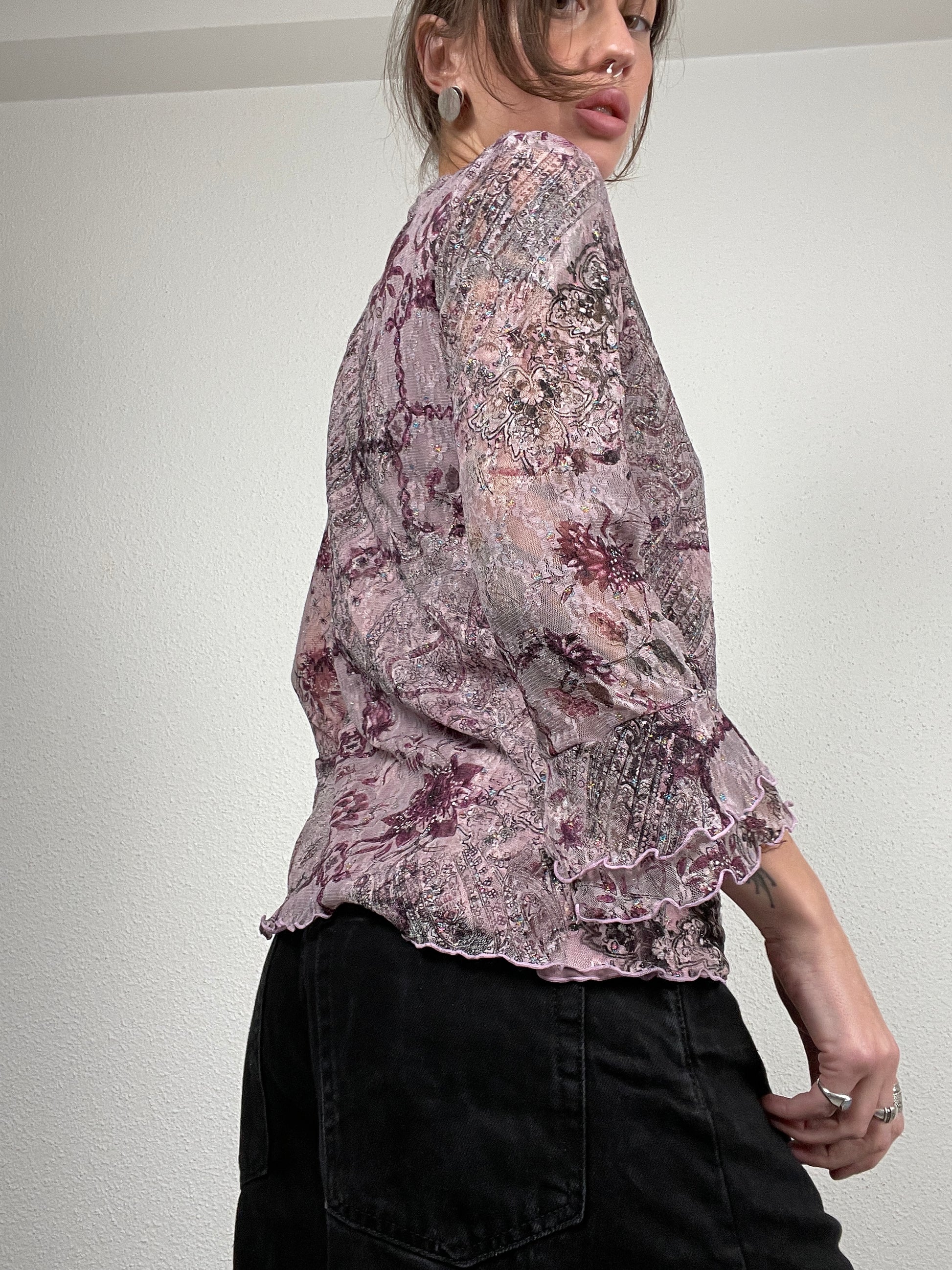 Romantic semi-sheer blouse with a shimmering floral lace overlay and subtle metallic thread detailing that catches the light beautifully. Features a flattering V-neckline, soft stretch fit, and delicate lettuce-edge hems on sleeves and bottom. Slightly flared 3/4 sleeves add a dreamy, feminine silhouette. A quintessential Y2K piece — perfect styled with low-rise jeans or a midi skirt for that effortless vintage charm.