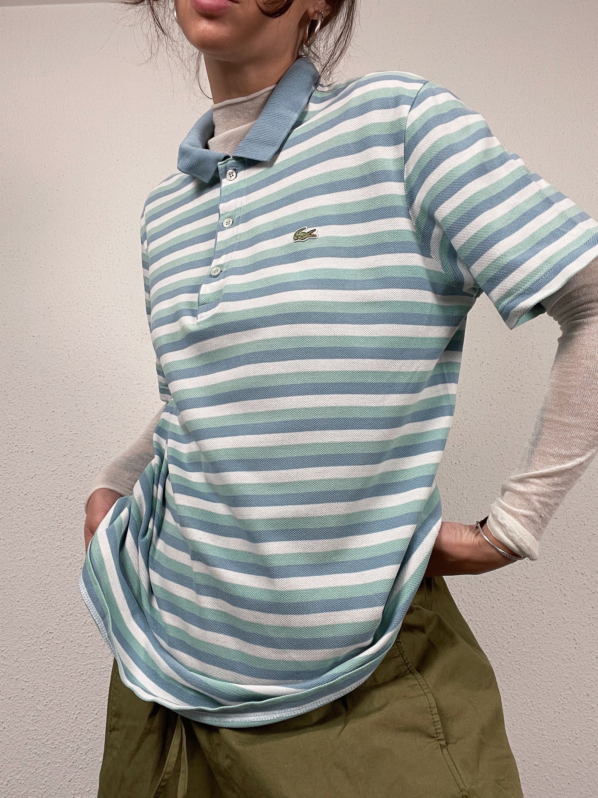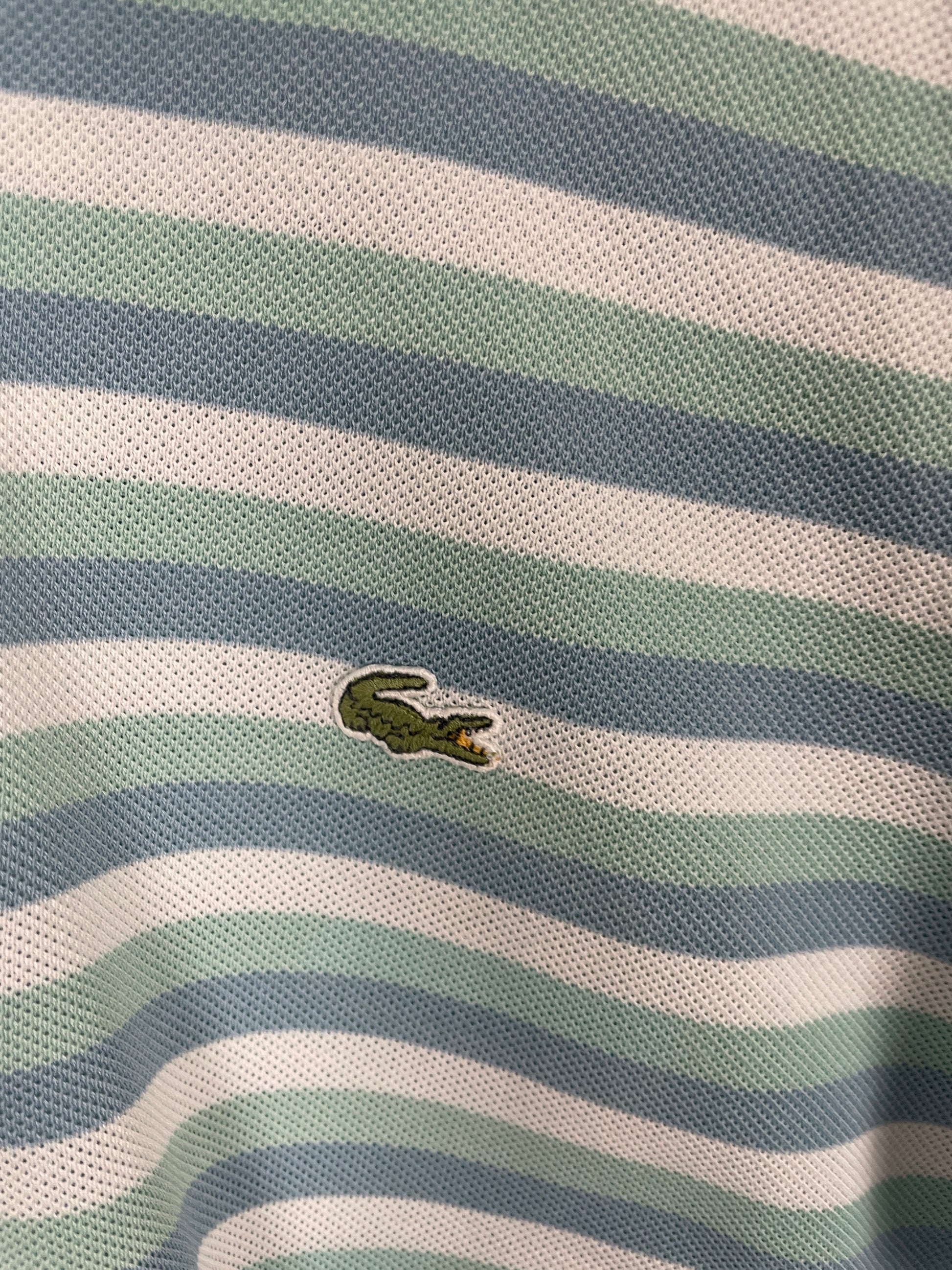 Vintage Lacoste striped polo shirt from late 90s / early 2000s. Classic cotton pique texture with mint green, sky blue and white stripes. Features embroidered crocodile logo, three-button placket and timeless preppy silhouette.