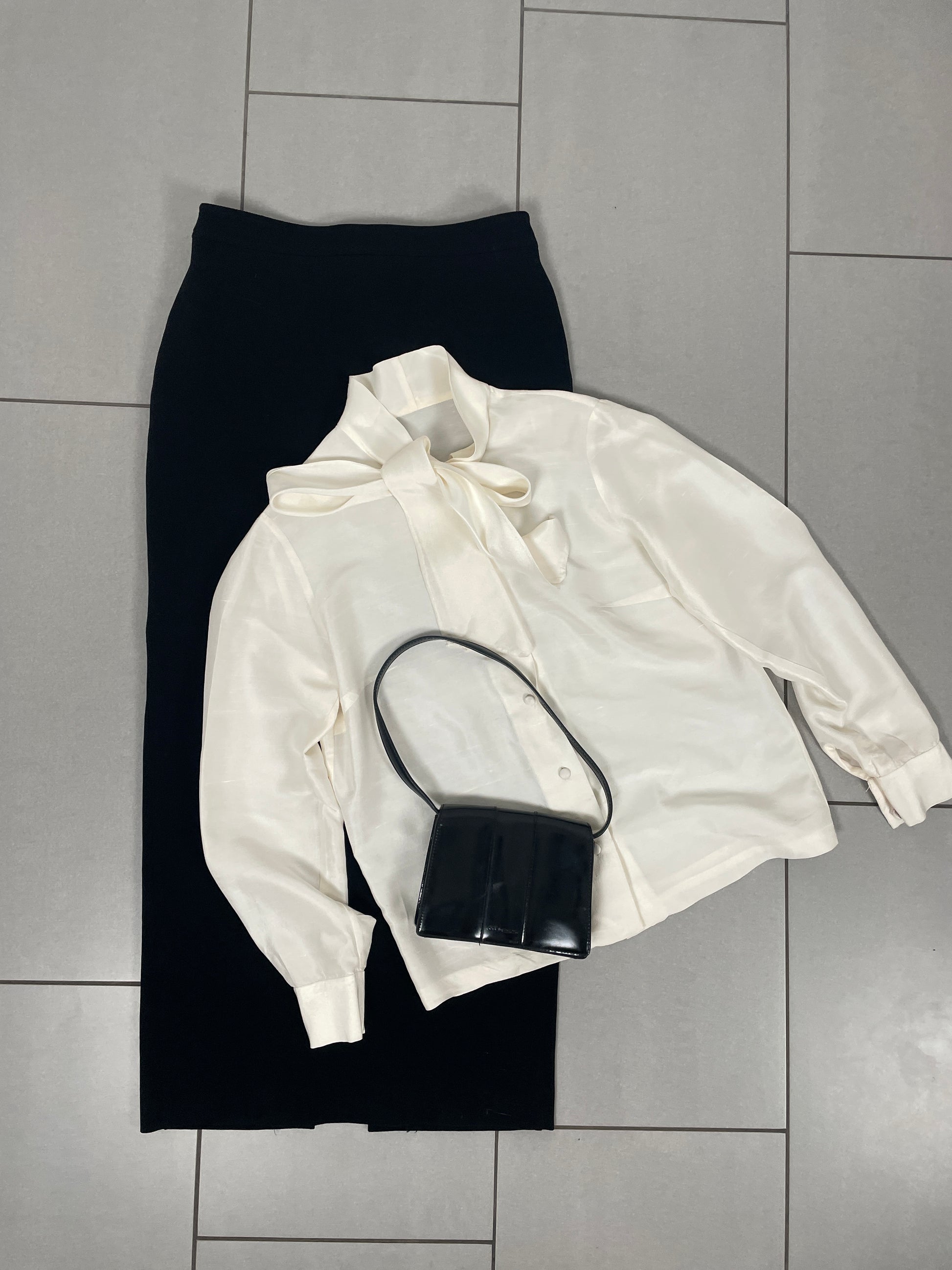 Elegant vintage blouse in pure ivory silk, featuring a graceful bow tie at the neck and fabric-covered buttons. Designed with puffed sleeves and tailored cuffs, it’s a timeless piece perfect for both office and evening looks.