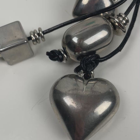 Statement pendant necklace from the 2000s featuring chunky silver-tone beads and geometric charms, including hearts and a cube, strung on a black cord. Perfect accessory to add a bold Y2K edge to everyday or party looks.