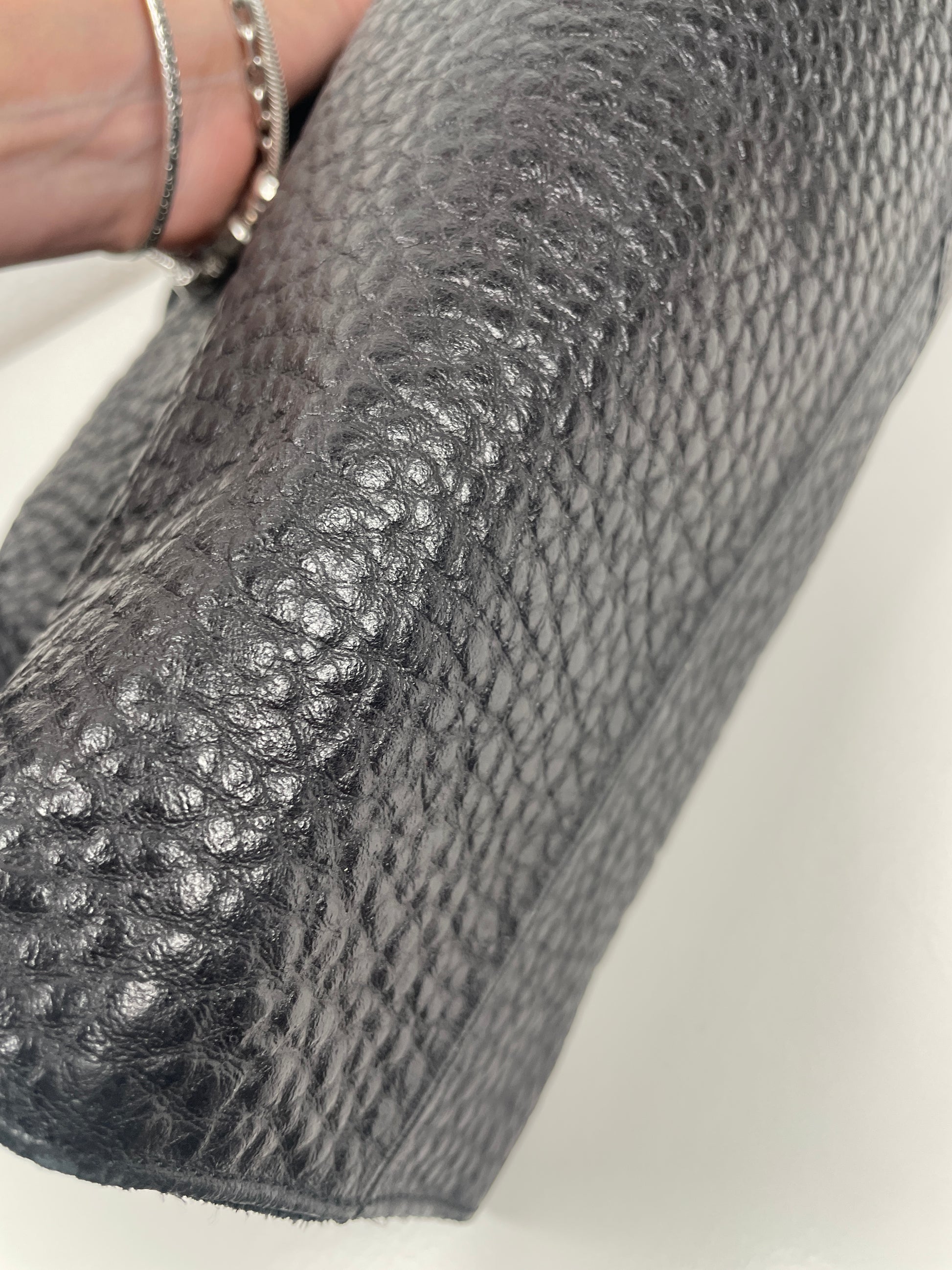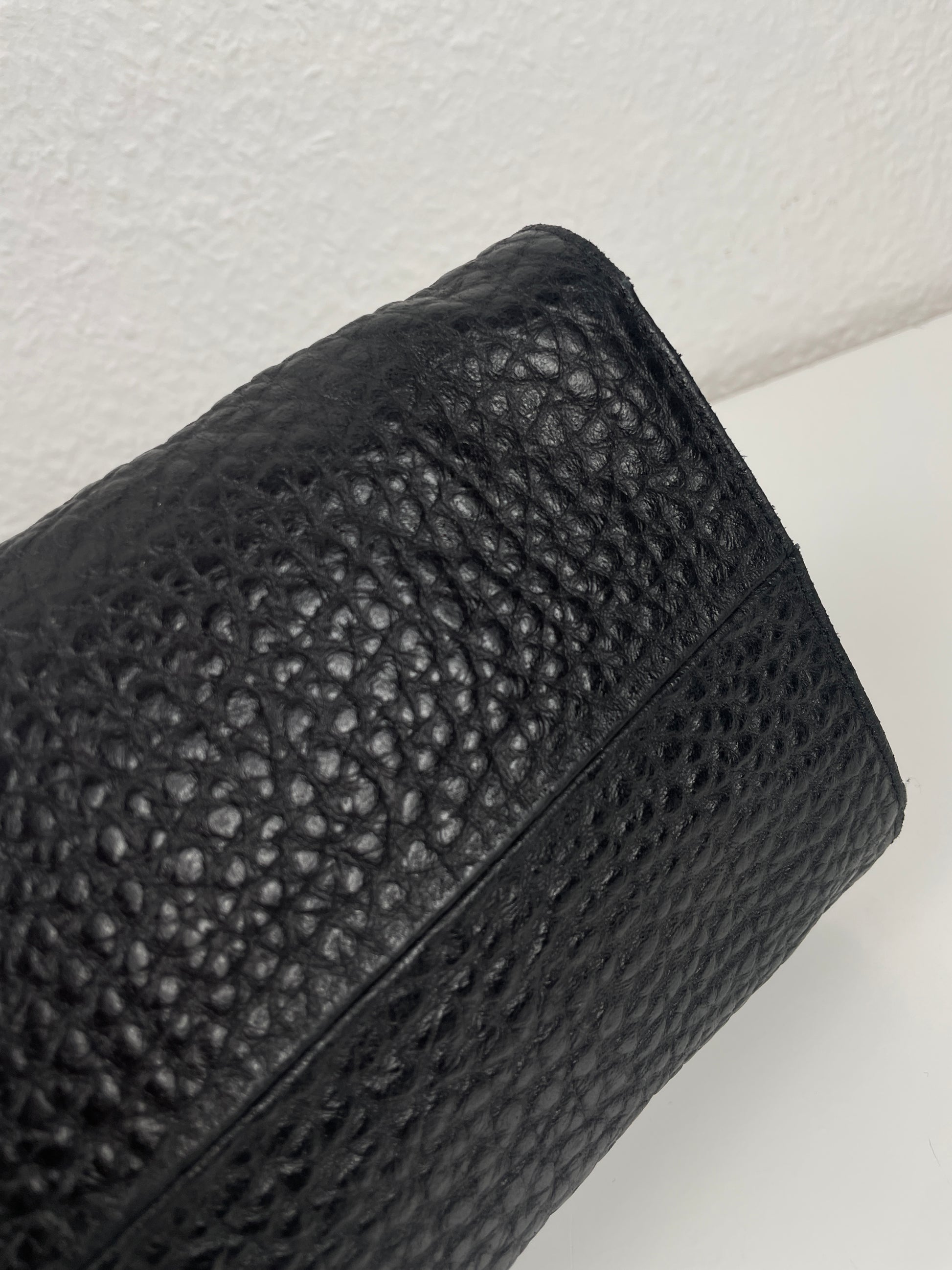 Classic vintage handbag crafted from textured black leather with smooth leather accents. Features a silver-tone buckle detail with magnetic snap closure and sturdy double handles. Spacious interior makes it practical for everyday wear while maintaining a sleek, minimalist design. Likely from the late 1990s–early 2000s.
