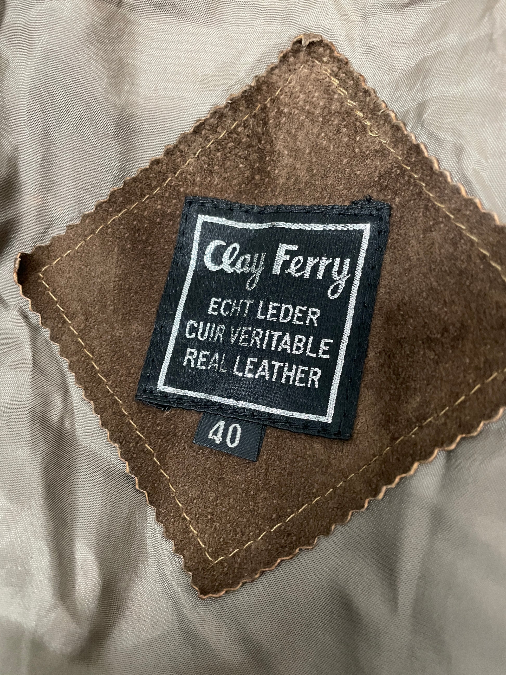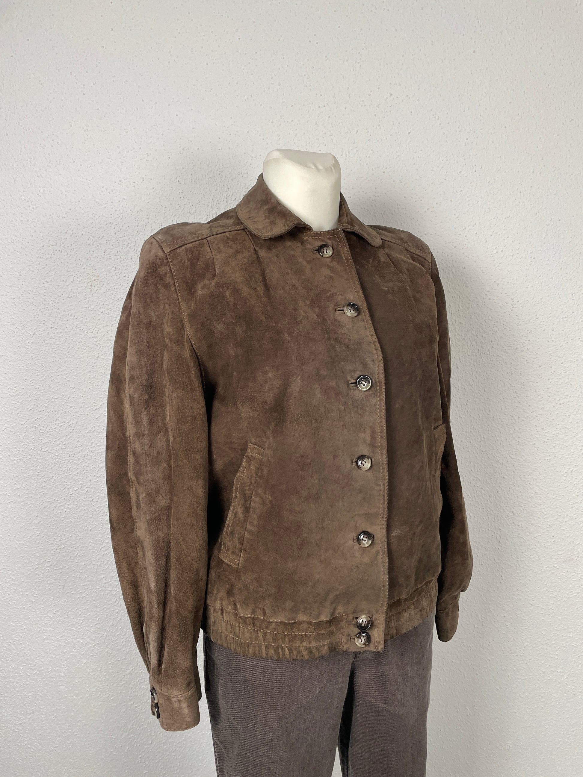 1980s brown suede jacket with a classic button-up front and relaxed straight fit. Features side pockets, buttoned cuffs, and subtle gathered hem. Crafted from genuine suede with visible vintage wear, including minor discoloration on the collar. Authentic vintage condition with natural patina.