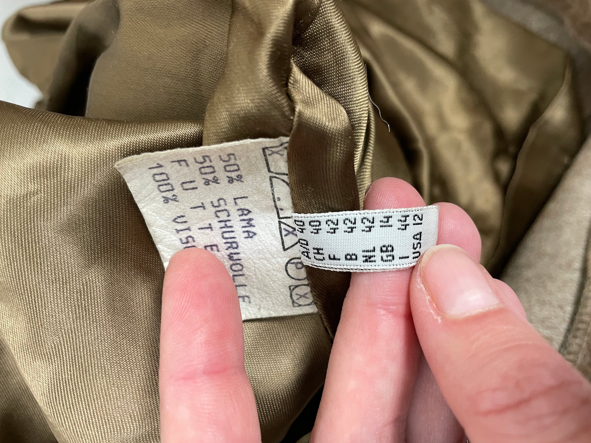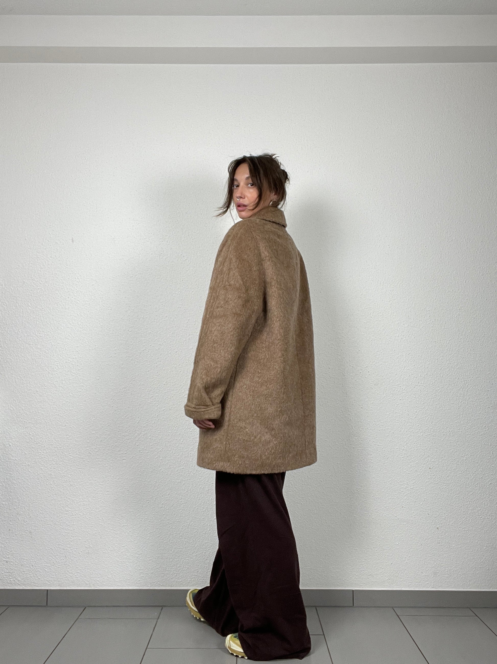 Late 1970s–early 1980s camel-colored coat made from a soft blend of lama and pure new wool. Features a rounded collar, button closure, and side pockets. Fully lined in smooth viscose. Warm and lightweight with a slightly oversized silhouette — timeless vintage classic.