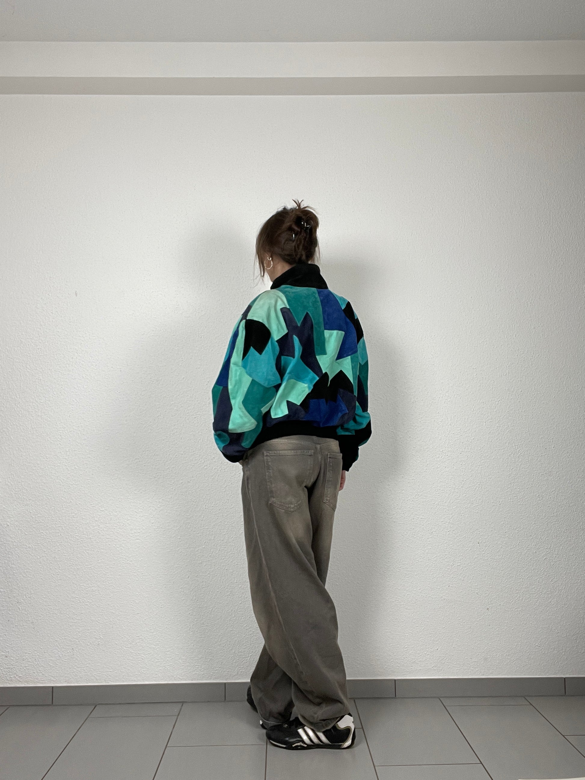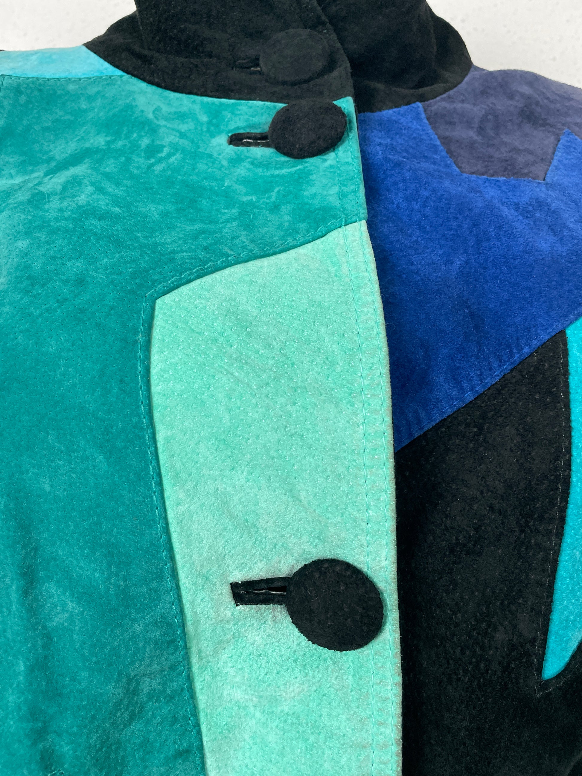 Late 1980s genuine suede bomber jacket with geometric patchwork in teal, turquoise, navy, and black. Features a high collar, covered buttons, and ribbed trim. Cropped, structured fit. Statement vintage piece in great condition.
