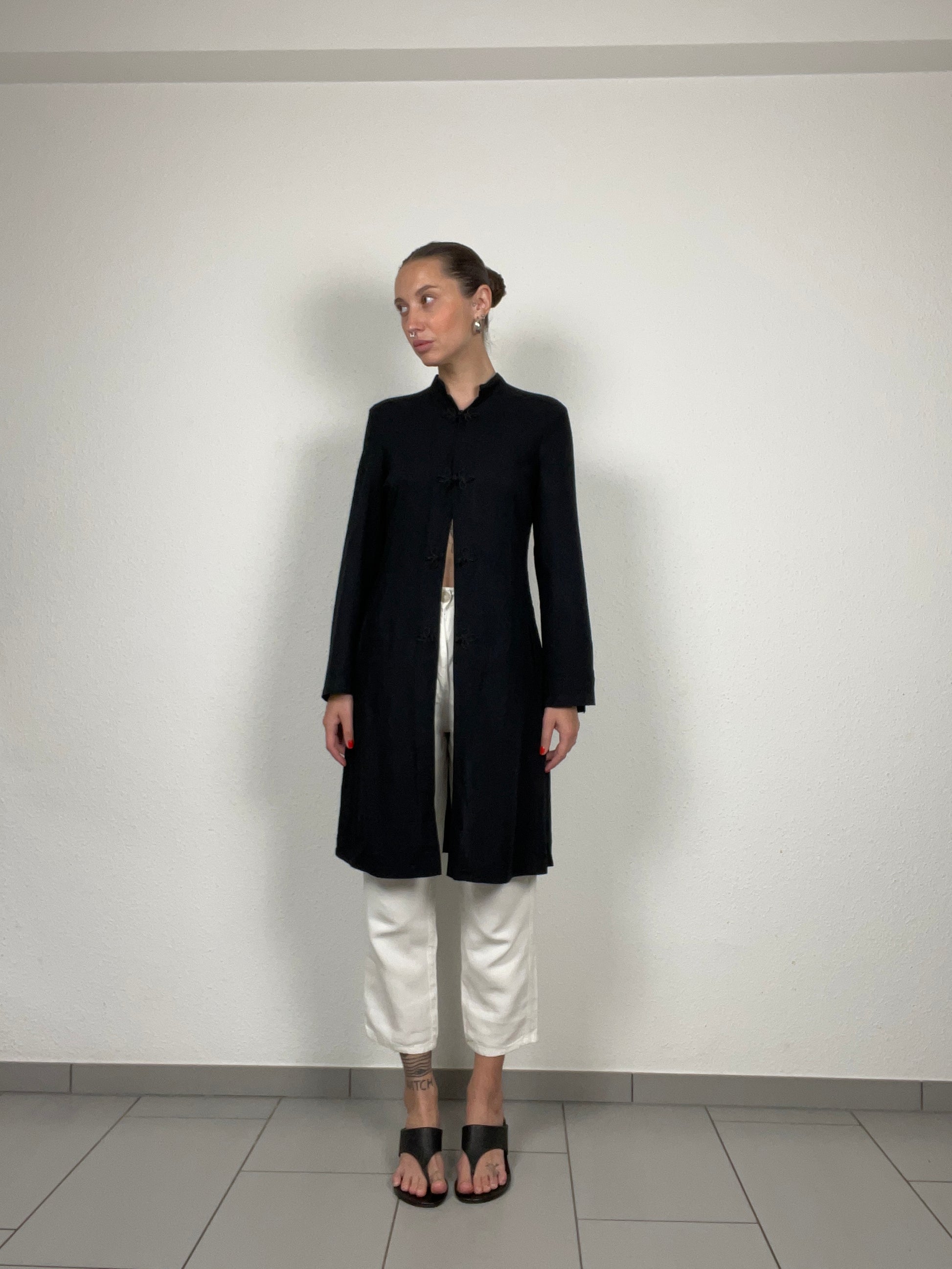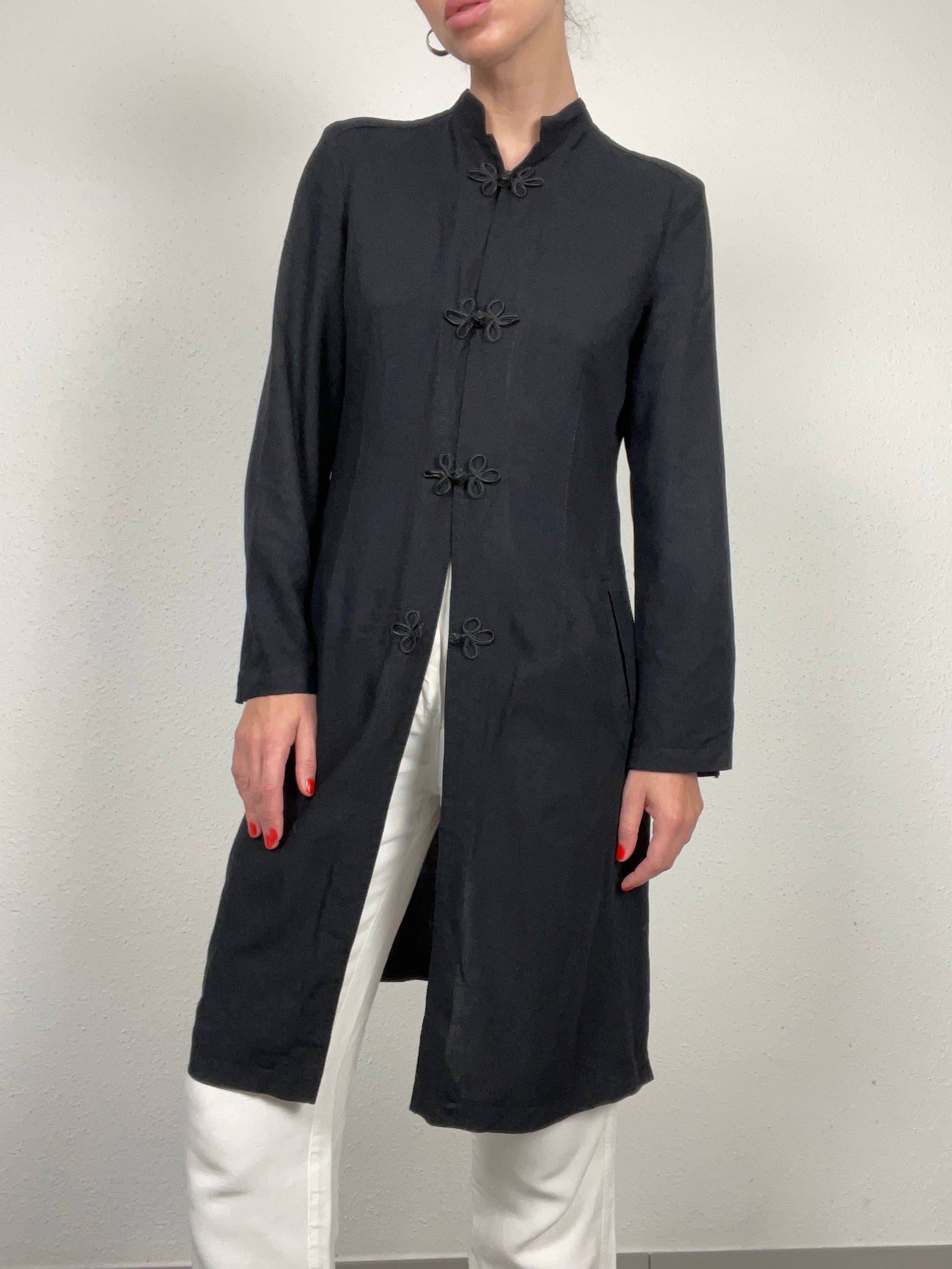 Vintage longline jacket by Apart Impressions in classic black. Designed with a Mandarin collar, traditional frog button closures, and long sleeves. Crafted from a viscose-linen blend, offering a lightweight yet structured drape. The side slits and mid-thigh length create an elegant, elongated silhouette. A versatile layering piece that pairs equally well with tailored trousers or denim.