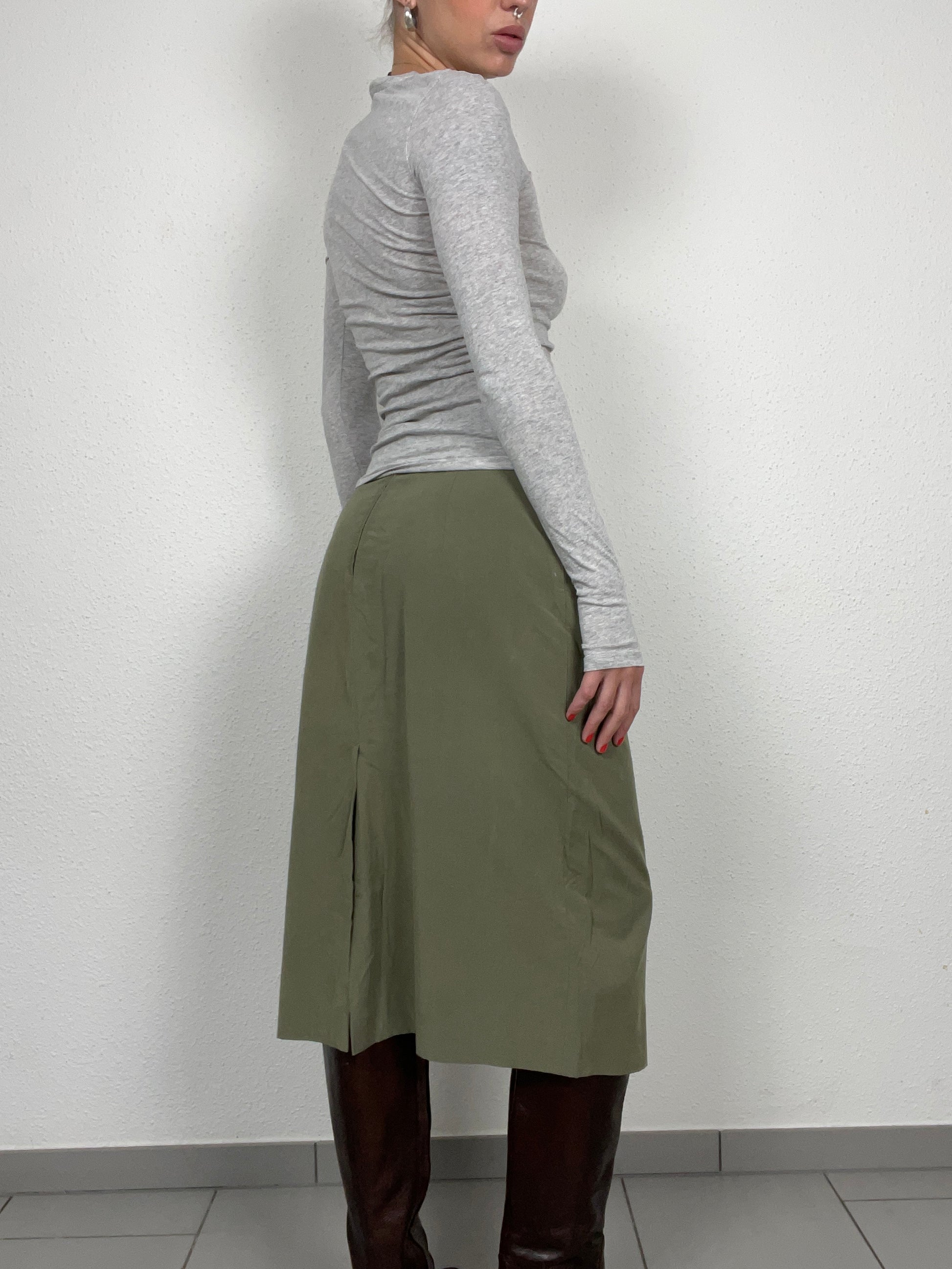 Timeless vintage olive-green midi skirt by Bianca, crafted in a lightweight viscose blend. Features a flattering A-line silhouette, full button-front closure, and practical side pockets. The mid-rise fit and clean tailoring make it versatile — perfect styled casually with knits or elevated with a blouse and boots. A classic piece from the late 90s–early 2000s era that carries understated elegance.
