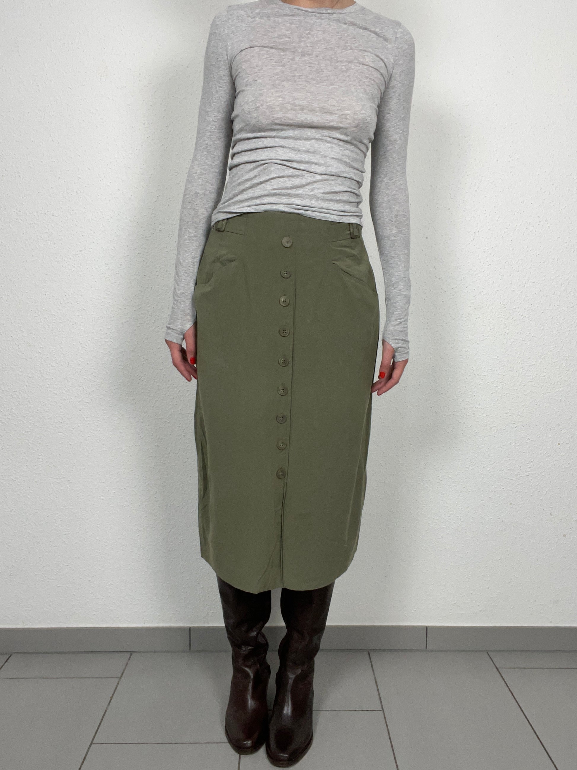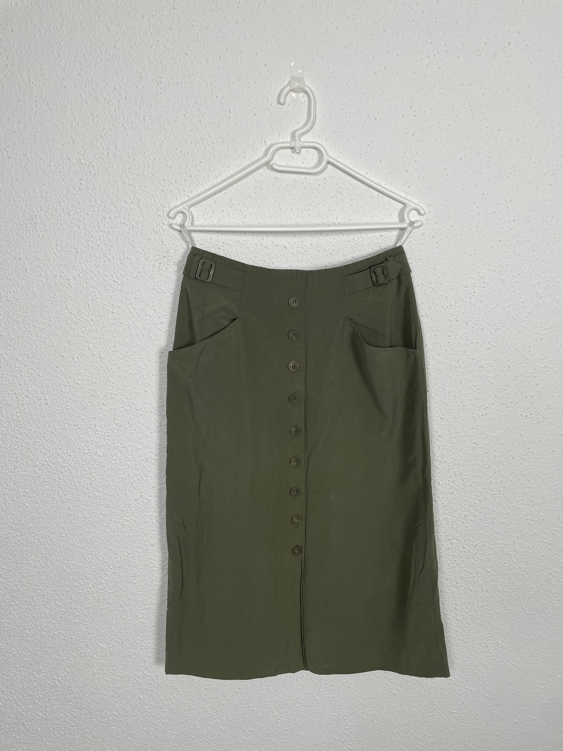 Vintage Bianca Olive Midi Skirt with Button Front – Size 38