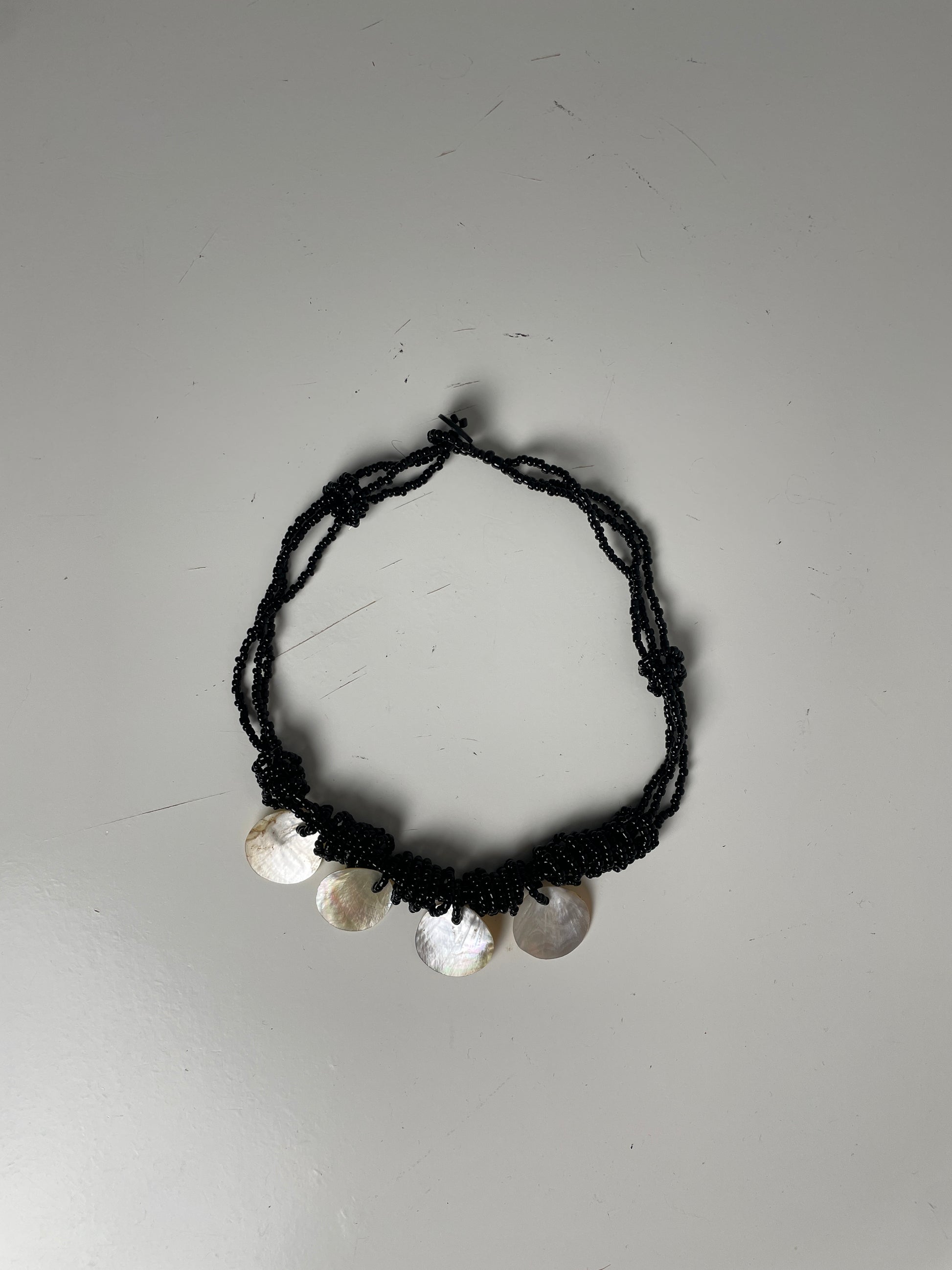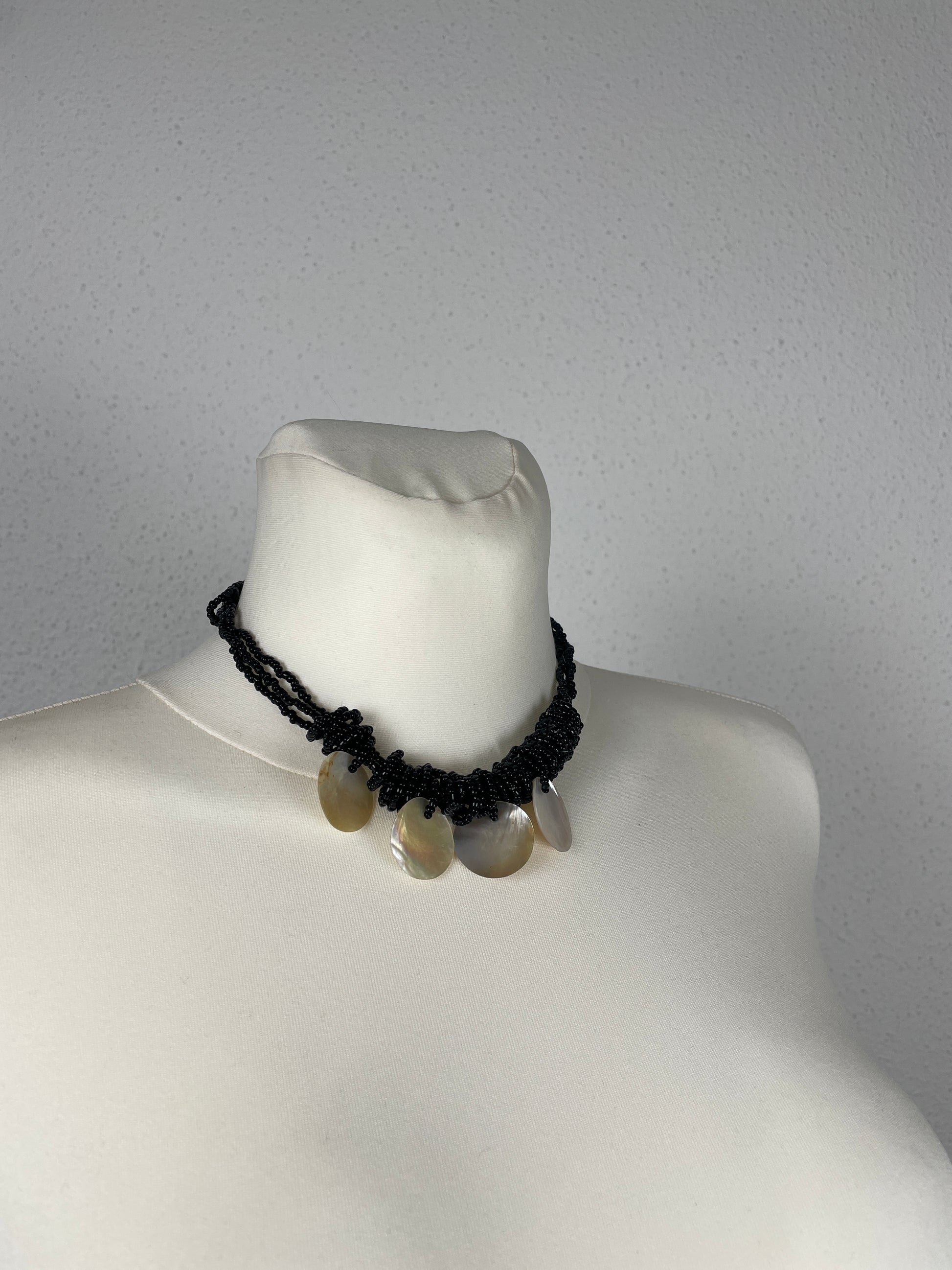 This unique vintage necklace features multiple strands of glossy black beads, accented with natural shell discs that catch the light beautifully. The layered design and button clasp closure add both texture and charm, making it a striking accessory for casual and evening looks alike.
