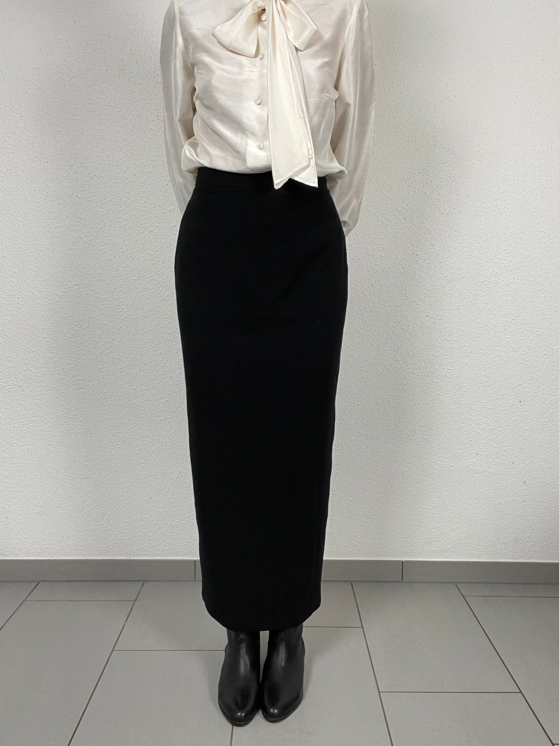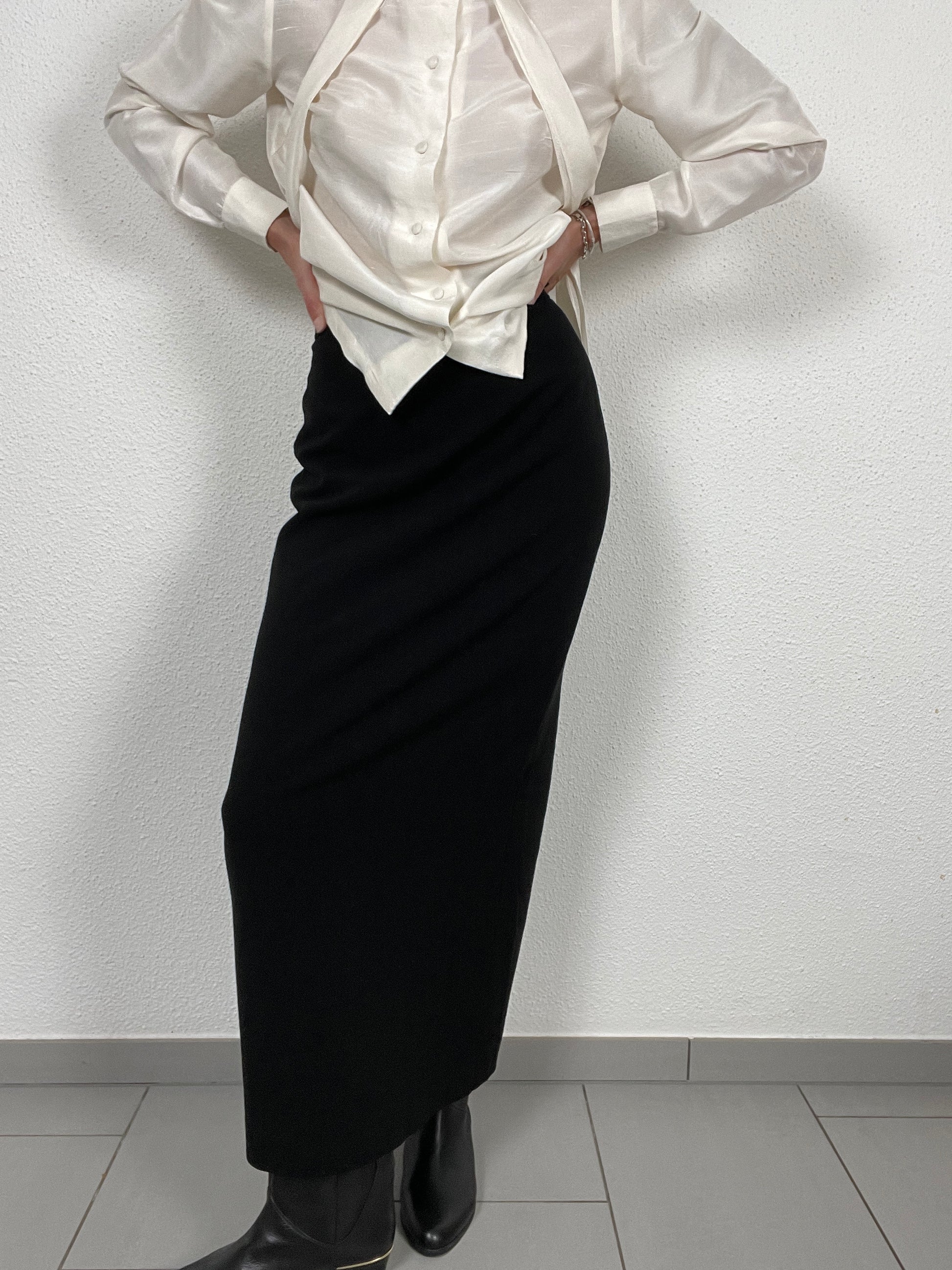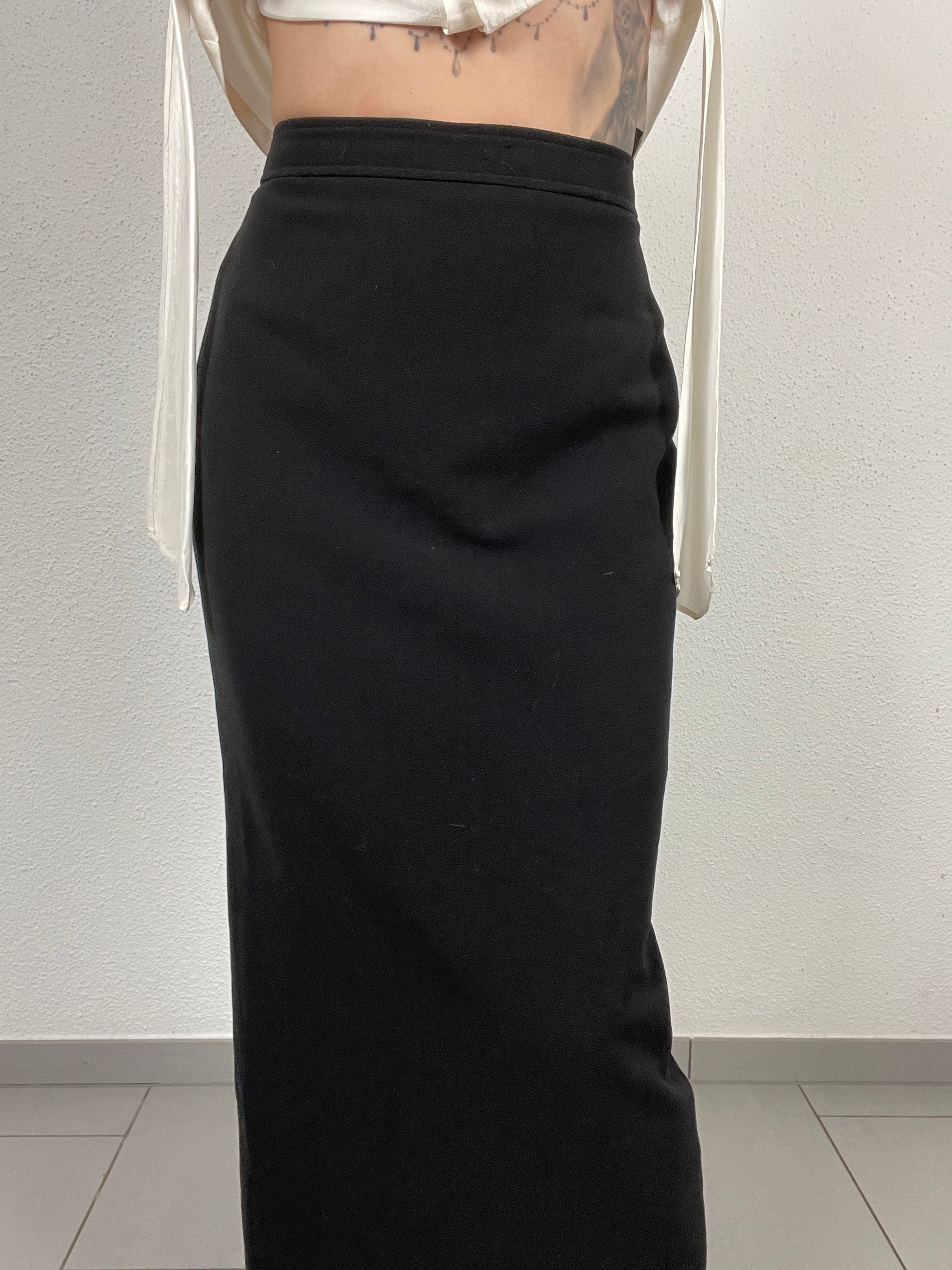 Elegant vintage black maxi skirt with a straight silhouette and back slit for ease of movement. Timeless and versatile, perfect for pairing with blouses or knitwear for a chic, sophisticated look.