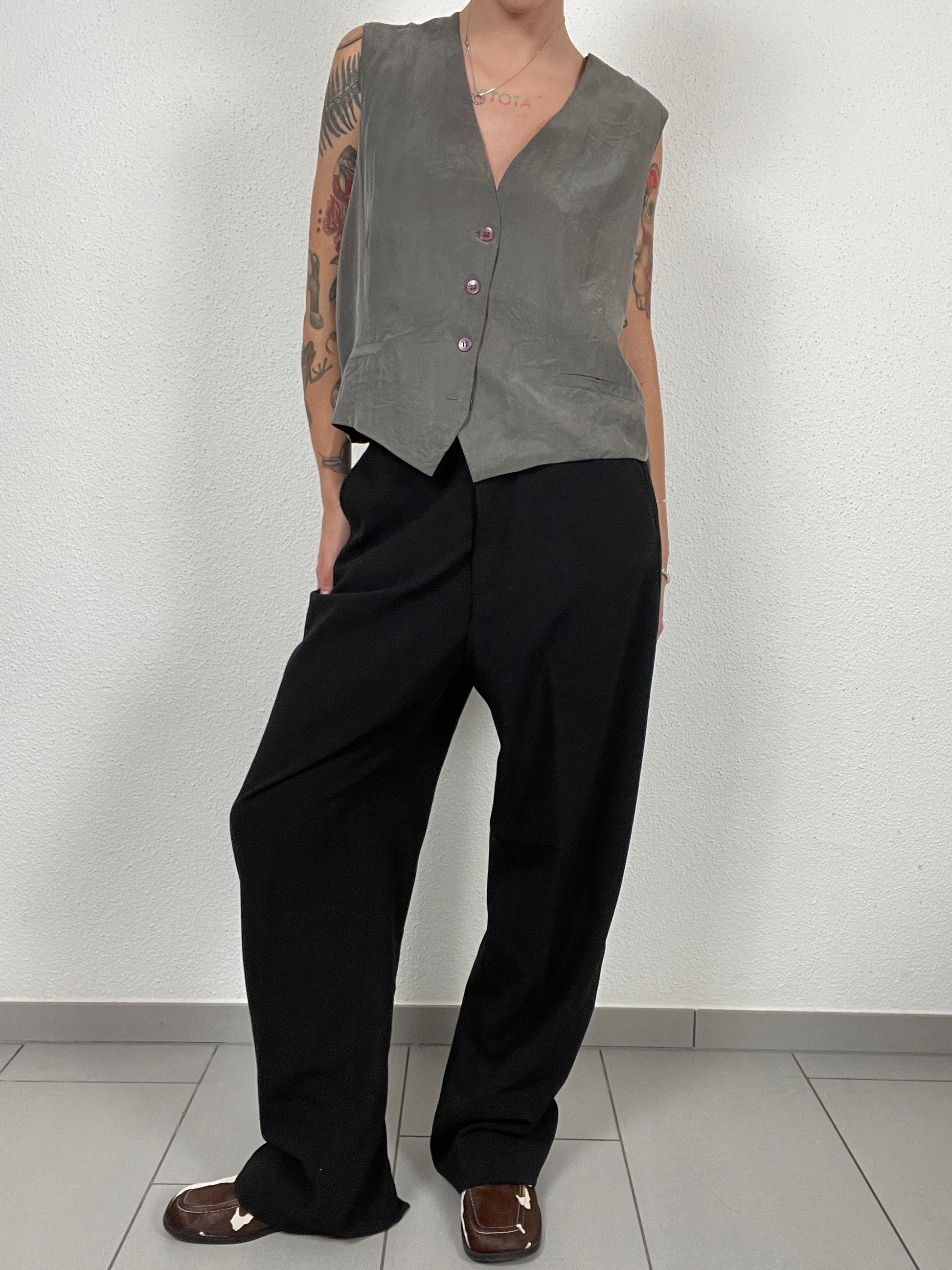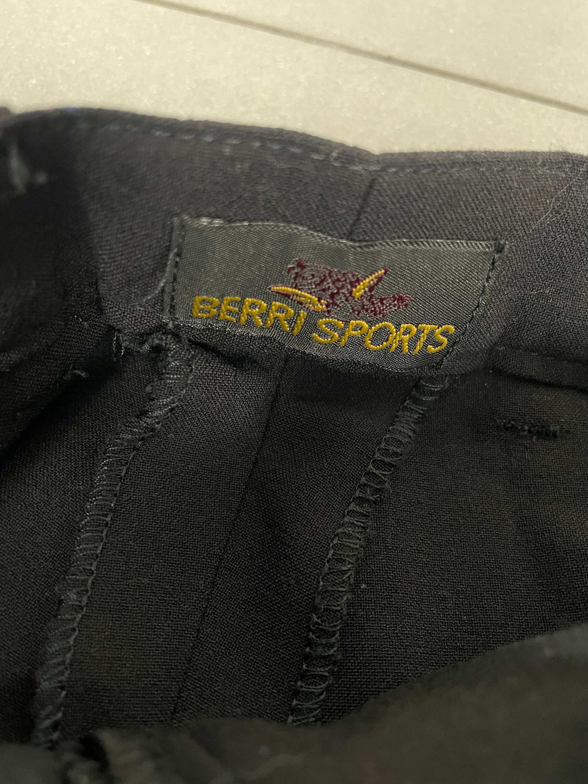 Classic vintage black trousers with a wide-leg silhouette, perfect for creating both casual and tailored looks. Designed with a mid-rise waist, they feature a straight cut through the hips and a relaxed drape for effortless styling. From the label Berri Sports, likely late 80s–90s production.