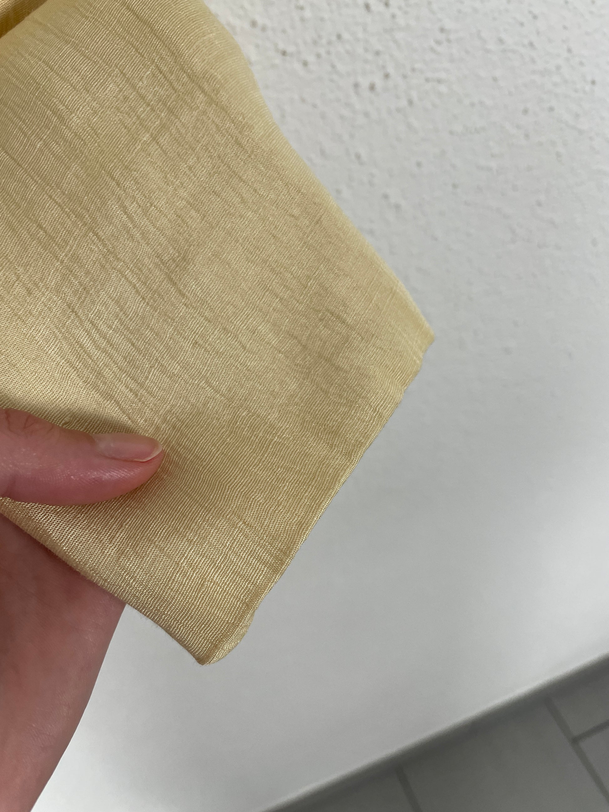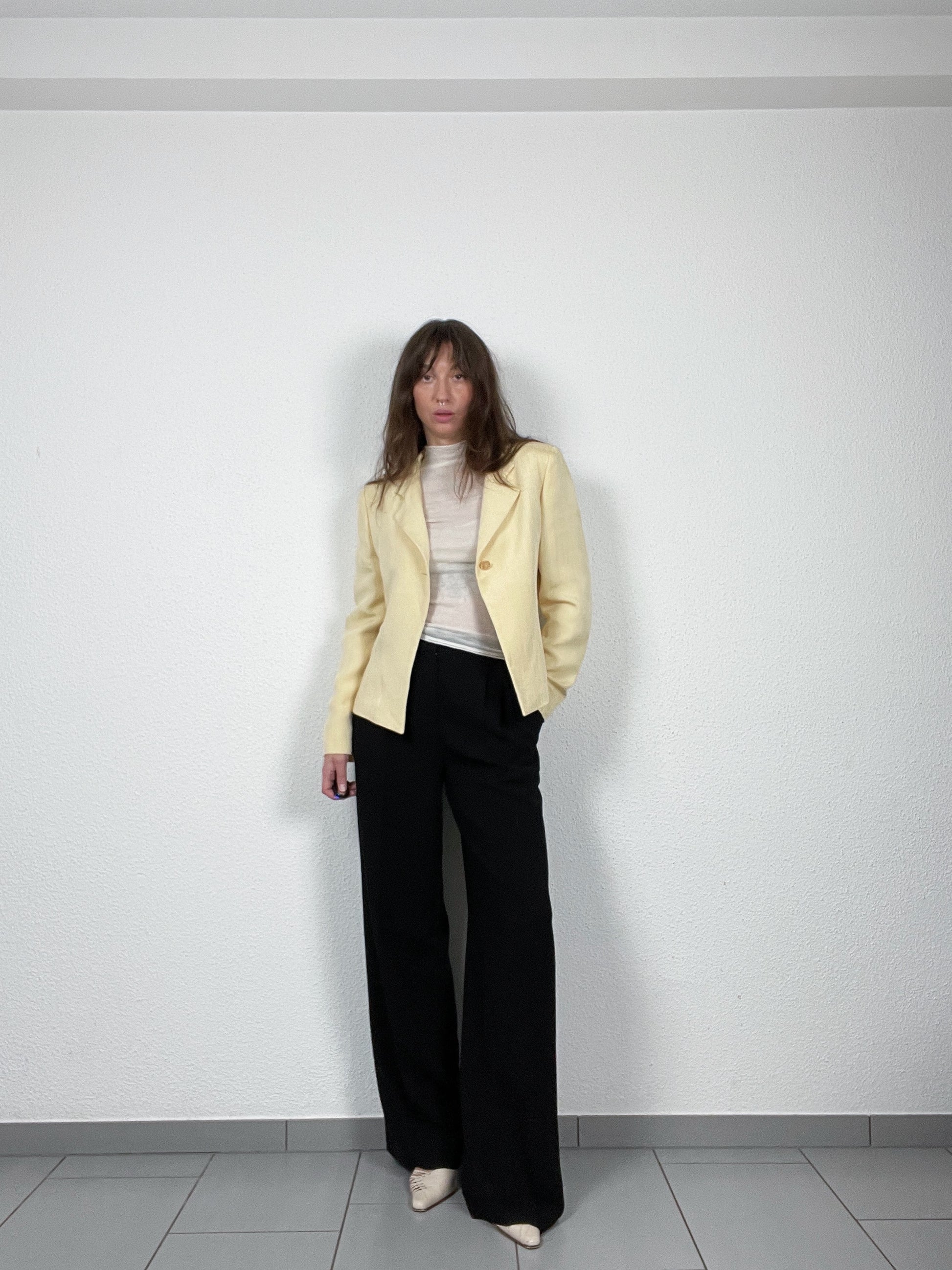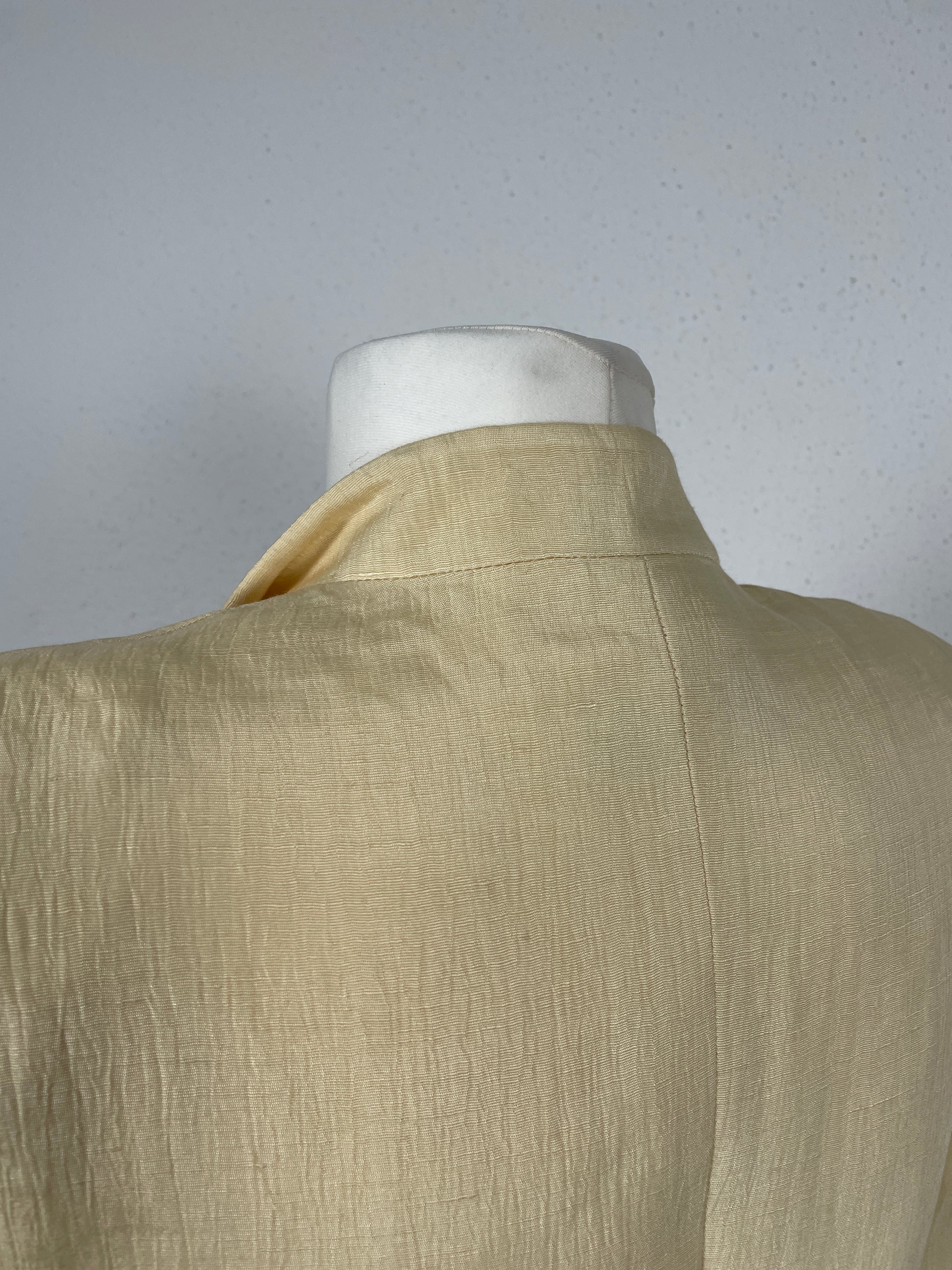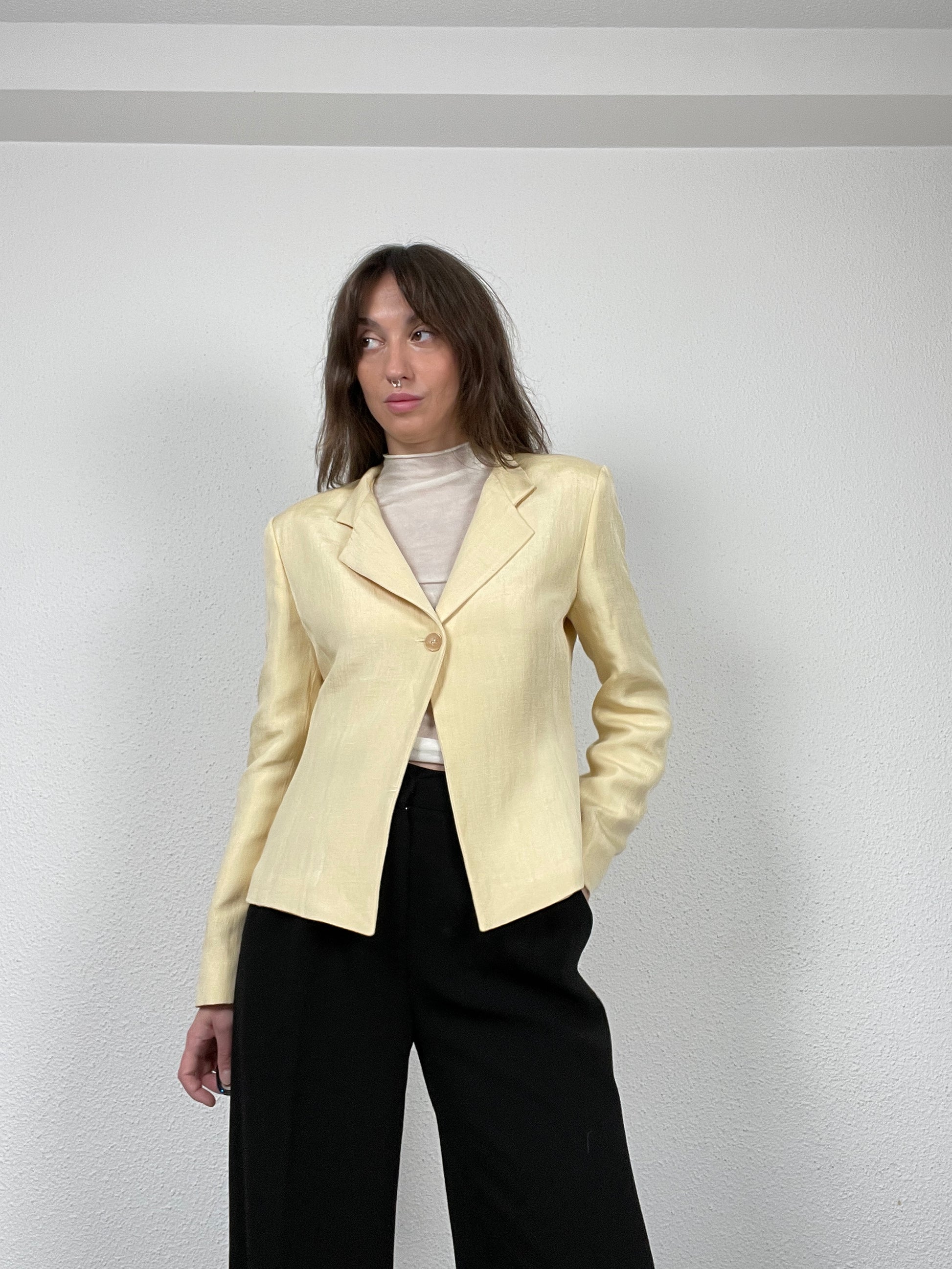 Lightweight vintage blazer by Marella, made in Italy. Features a soft yellow-beige tone, single-button closure, structured shoulders, and a cropped cut that highlights the waist. The linen-cotton-acetate blend gives it a refined drape with a subtle sheen — perfect layered over high-waisted trousers or a dress for an effortless 90s-inspired look.