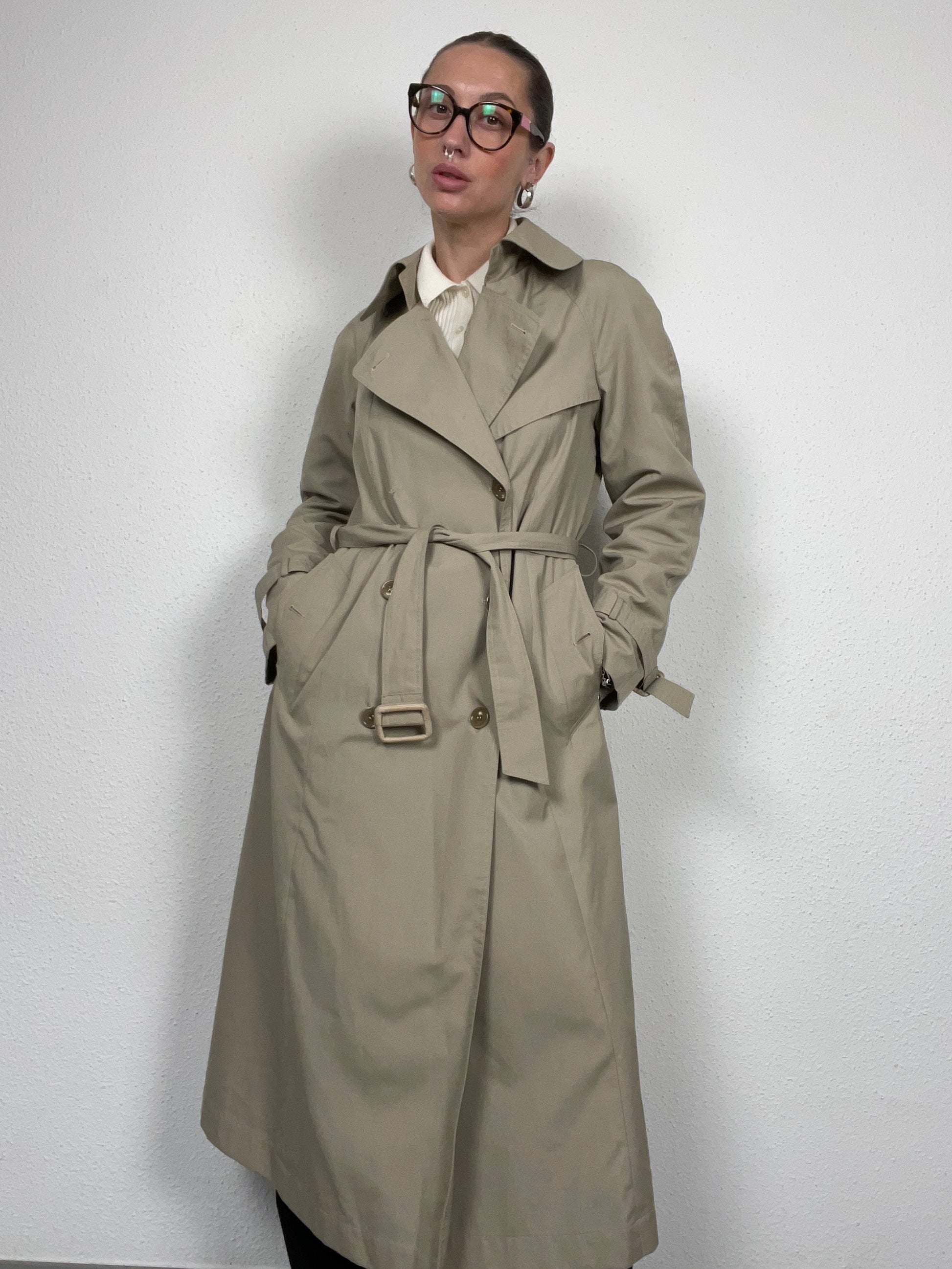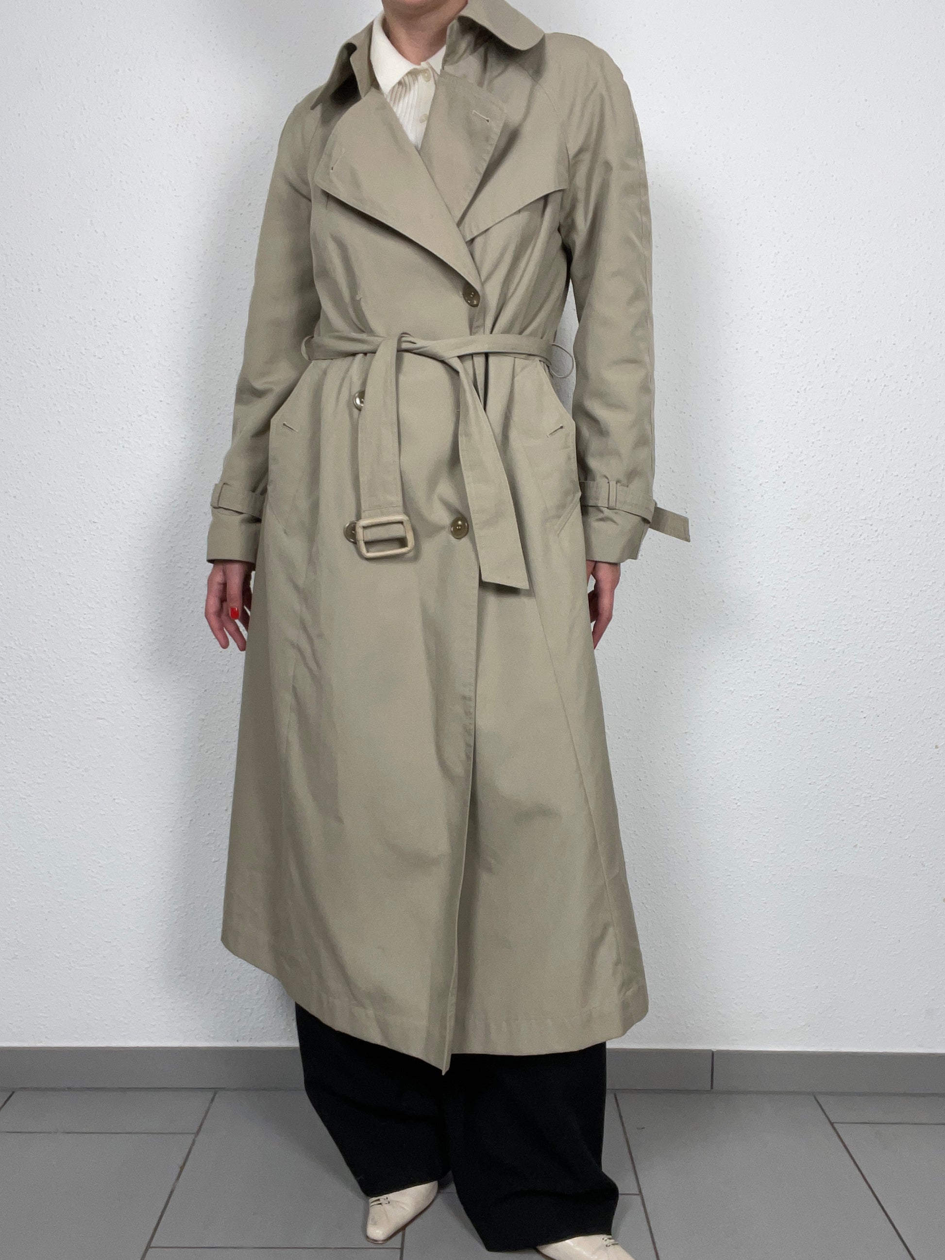 Timeless vintage trench coat in a classic beige tone. Features wide lapels, belted waist, double-breasted button closure, and adjustable sleeve straps. Its clean lines and versatile cut make it a wardrobe essential — perfect layered over tailoring or casual denim for a chic everyday look. Lightweight yet structured, this piece channels effortless sophistication.