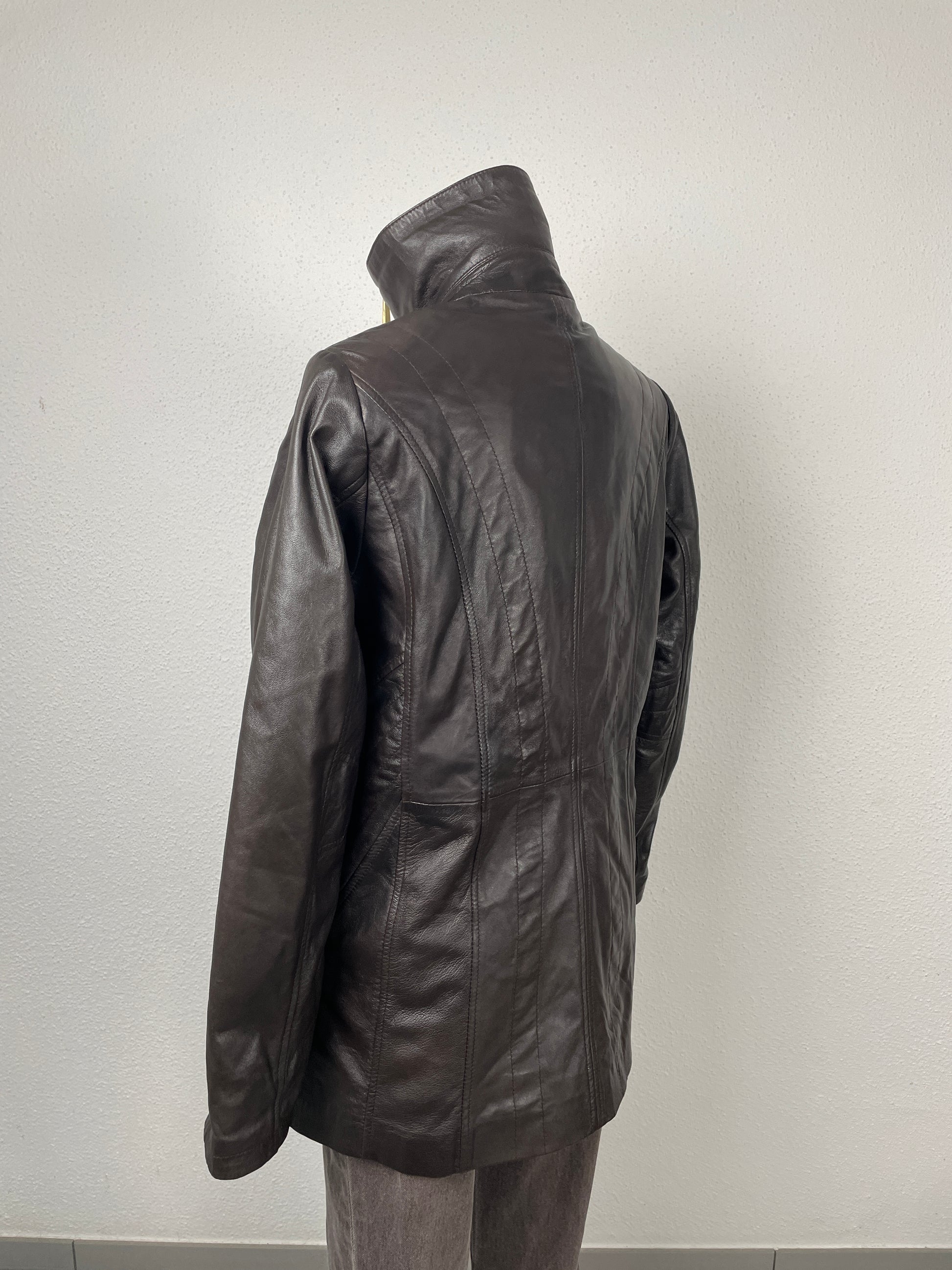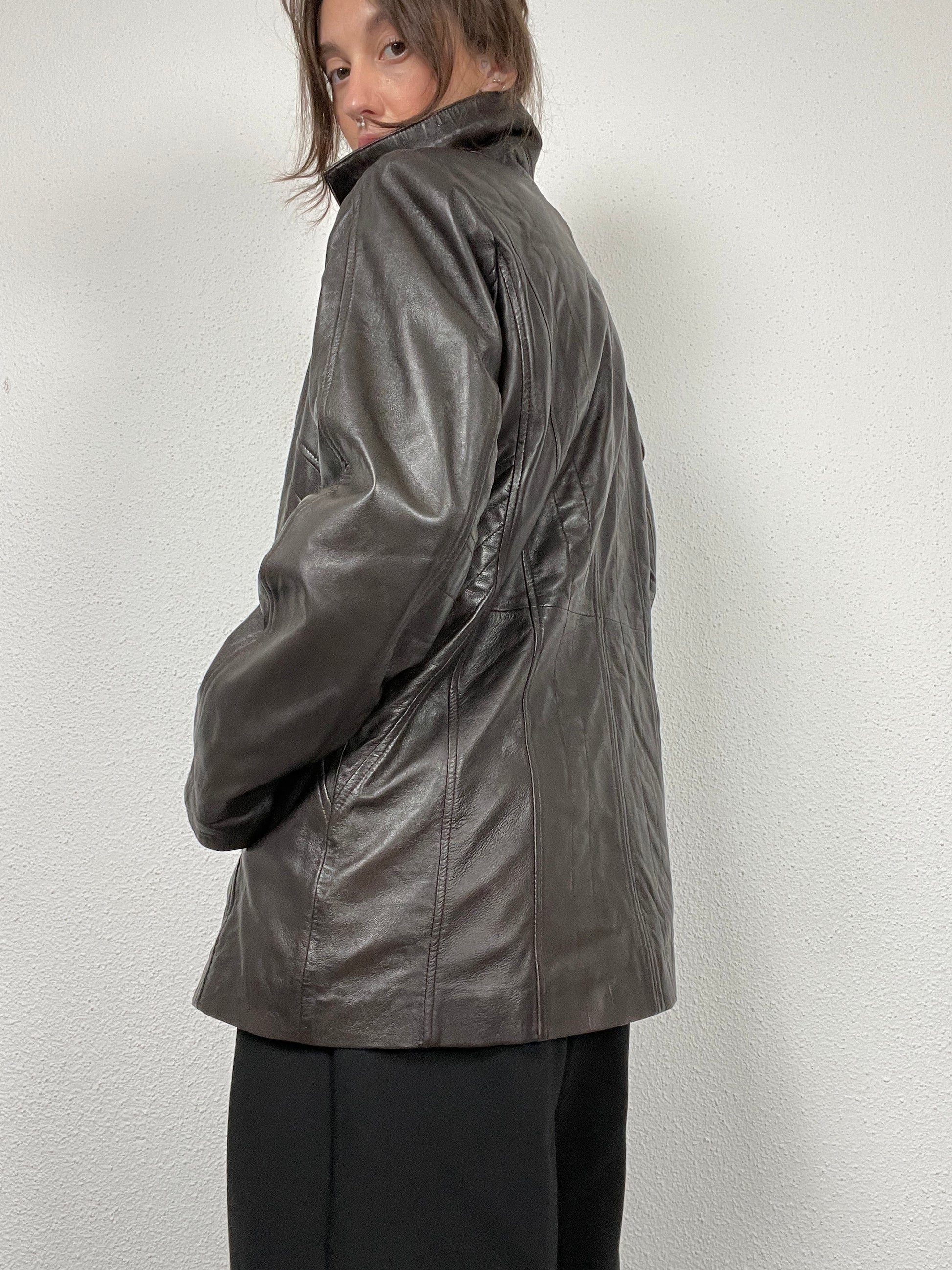 Early 2000s brown genuine sheepskin leather jacket with a sleek straight fit and high collar. Features front zipper closure, vertical panel detailing, and side pockets. Smooth leather with a soft satin lining — effortlessly elegant and timeless.