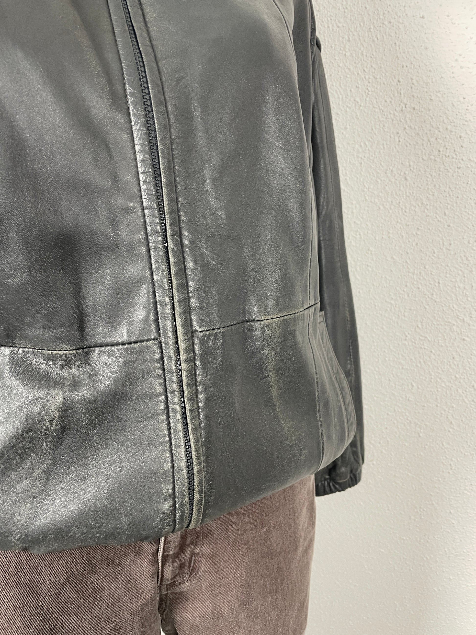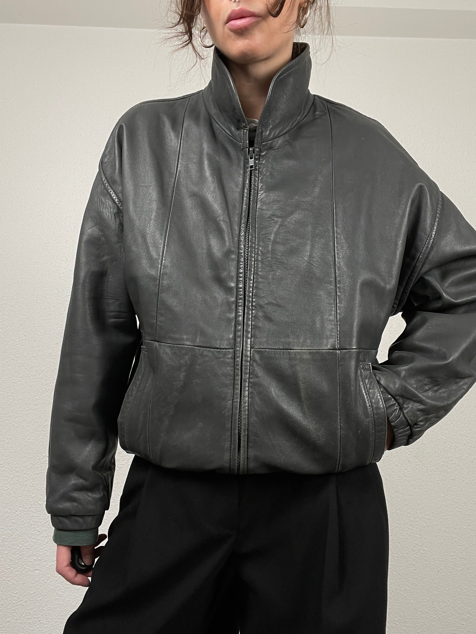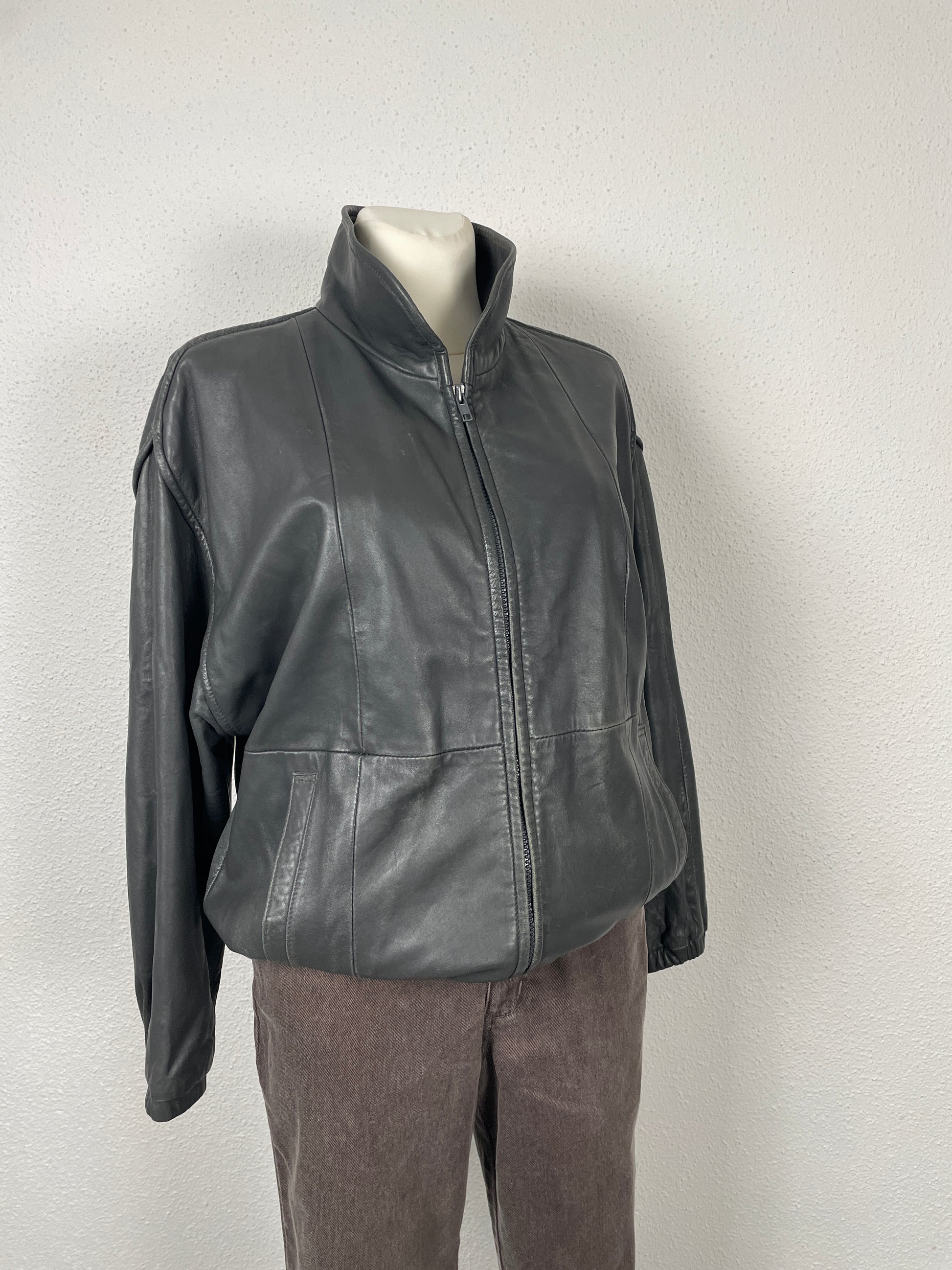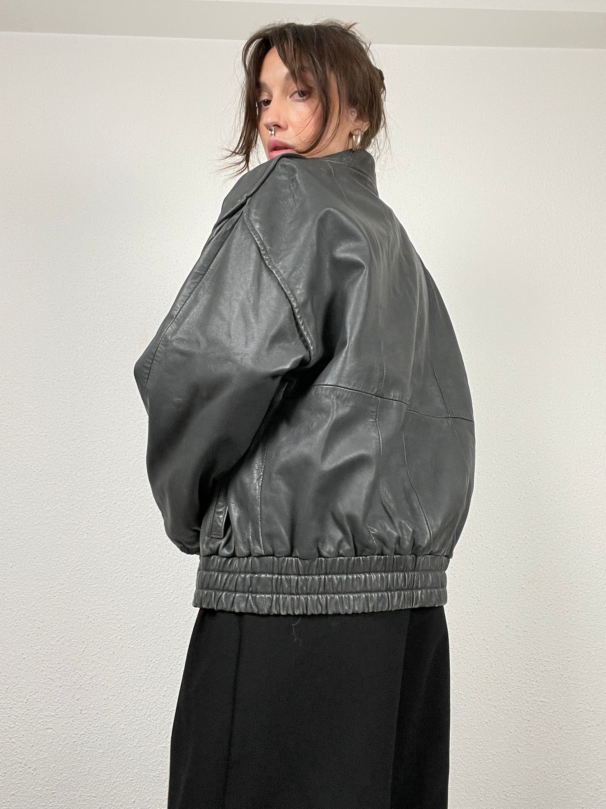 Late 1980s oversized gray leather bomber jacket with a relaxed fit and high collar. Features front zipper, elasticated hem and cuffs, and side pockets. Crafted from soft genuine leather with a subtle worn patina that adds authentic vintage character.