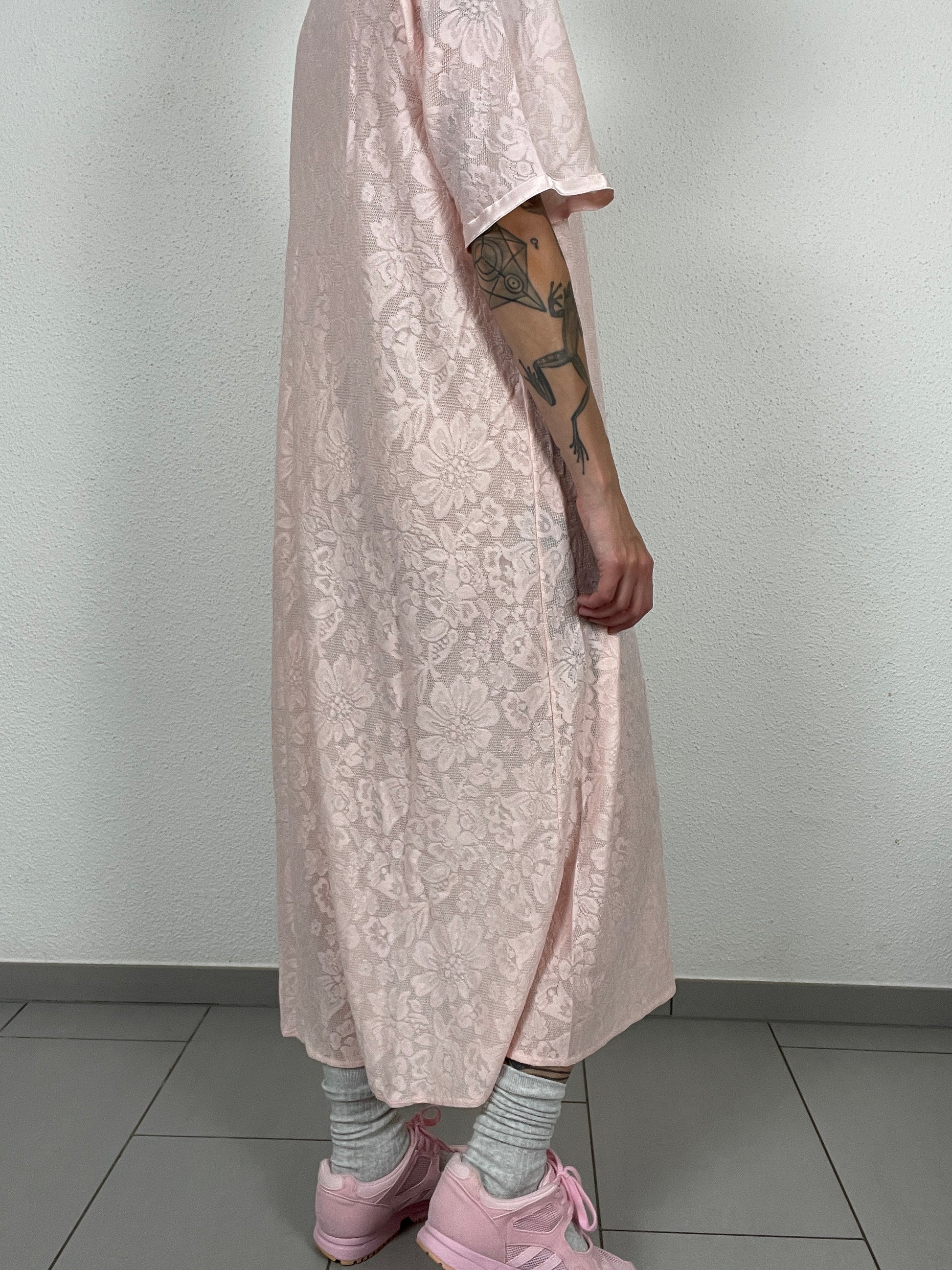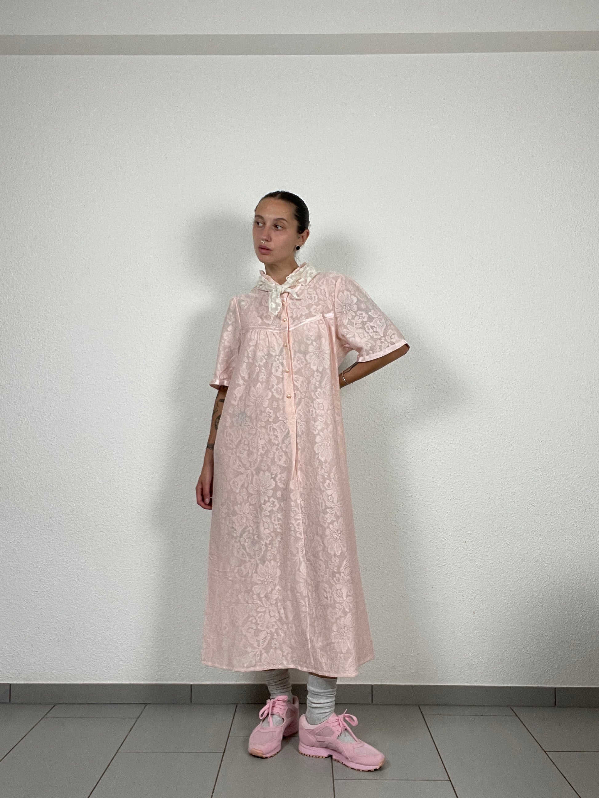 Romantic vintage nightgown by Swiss brand Hanro in delicate pink lace with satin trims and pearl-style buttons. Features short sleeves, a ruffled collar with bow detail, and a flowing maxi length. Collectible lingerie piece, perfect as loungewear or styled as a dress.