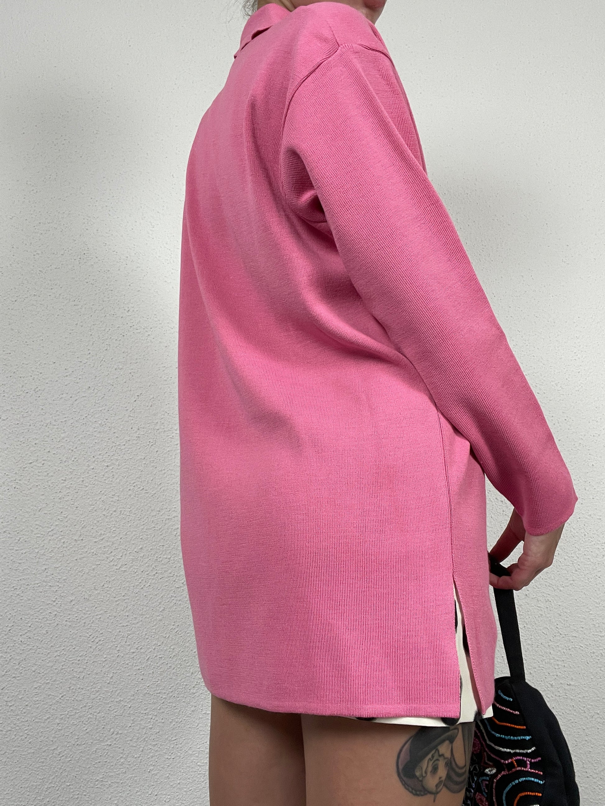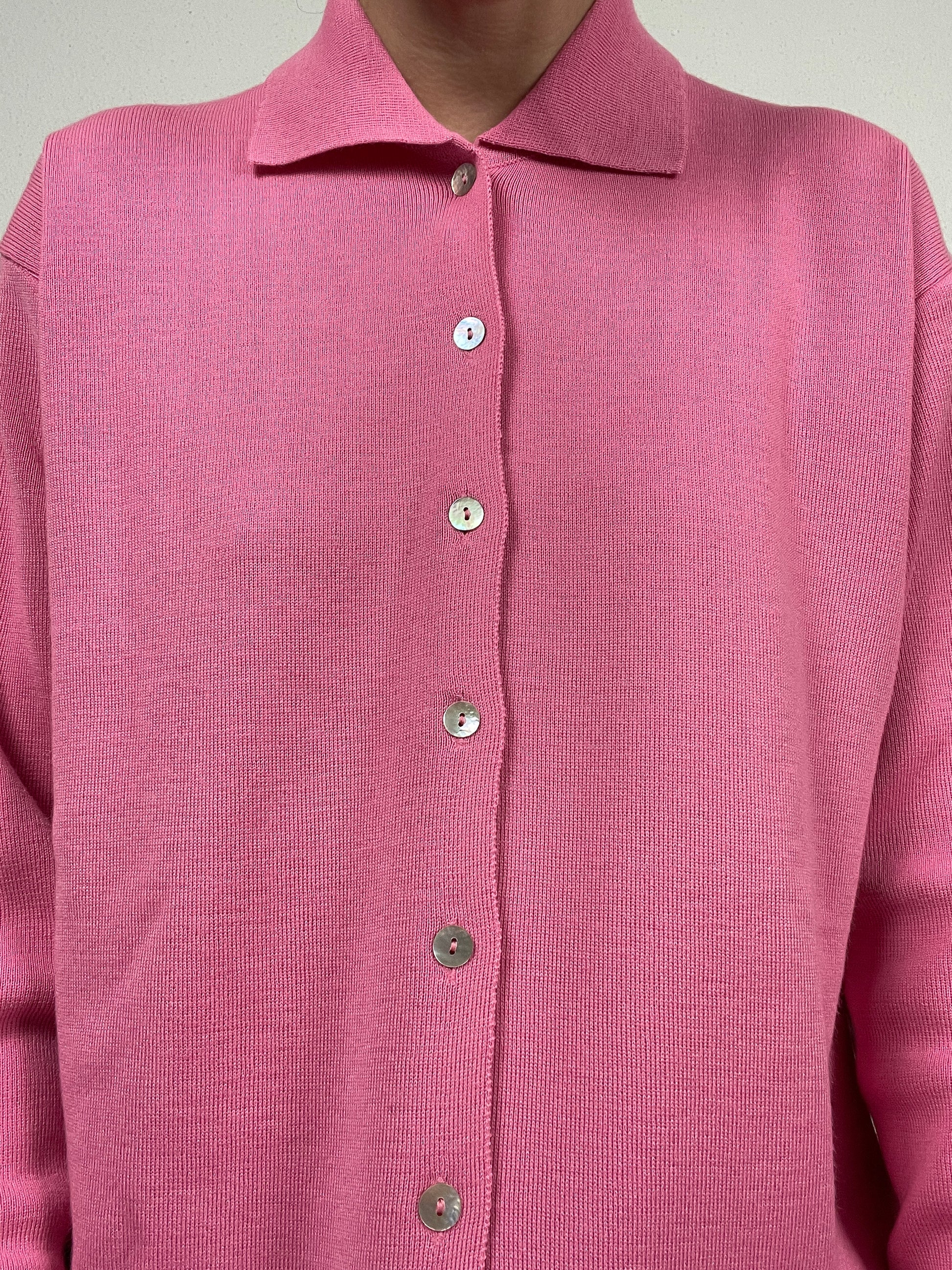 Bright vintage cardigan made in Italy from a soft merino wool blend in a vibrant pink tone. Features a pointed collar and button-down front, perfect to wear as a lightweight layer or on its own.