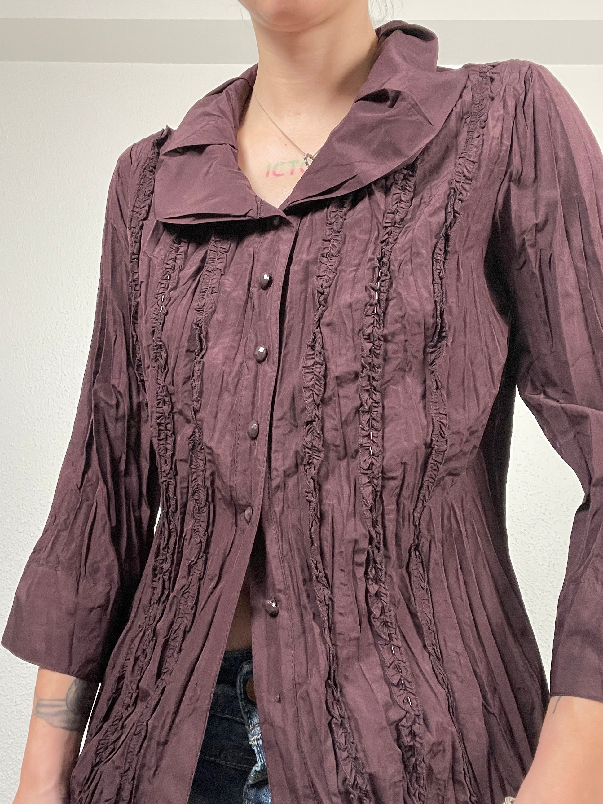 Burgundy fitted blouse with distinctive textural detailing and decorative pleats along the front. Features faceted buttons, a sculptural wide collar, and slightly flared ¾ sleeves for an elegant silhouette. The lightweight fabric holds its shape while remaining comfortable, adding a touch of structured femininity to any look.