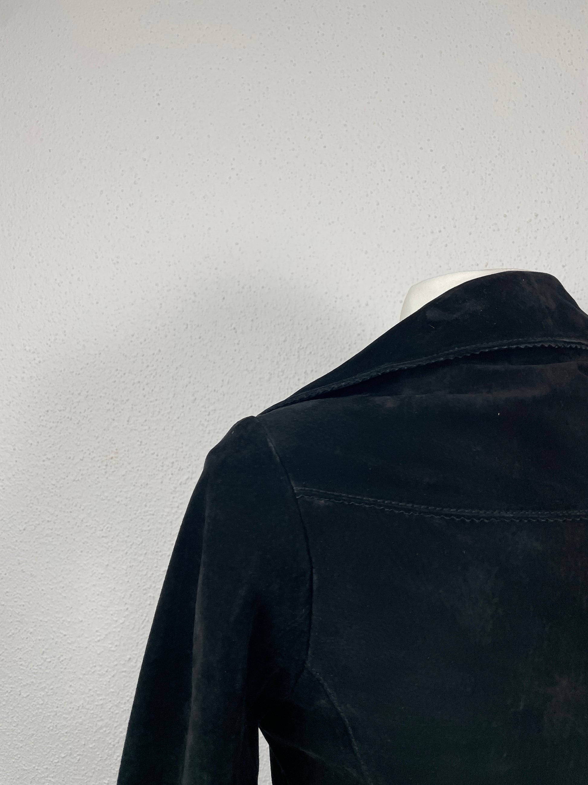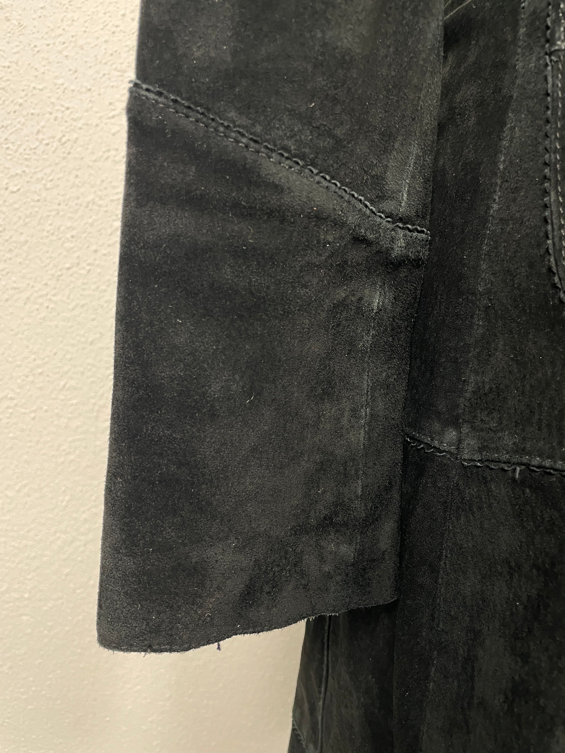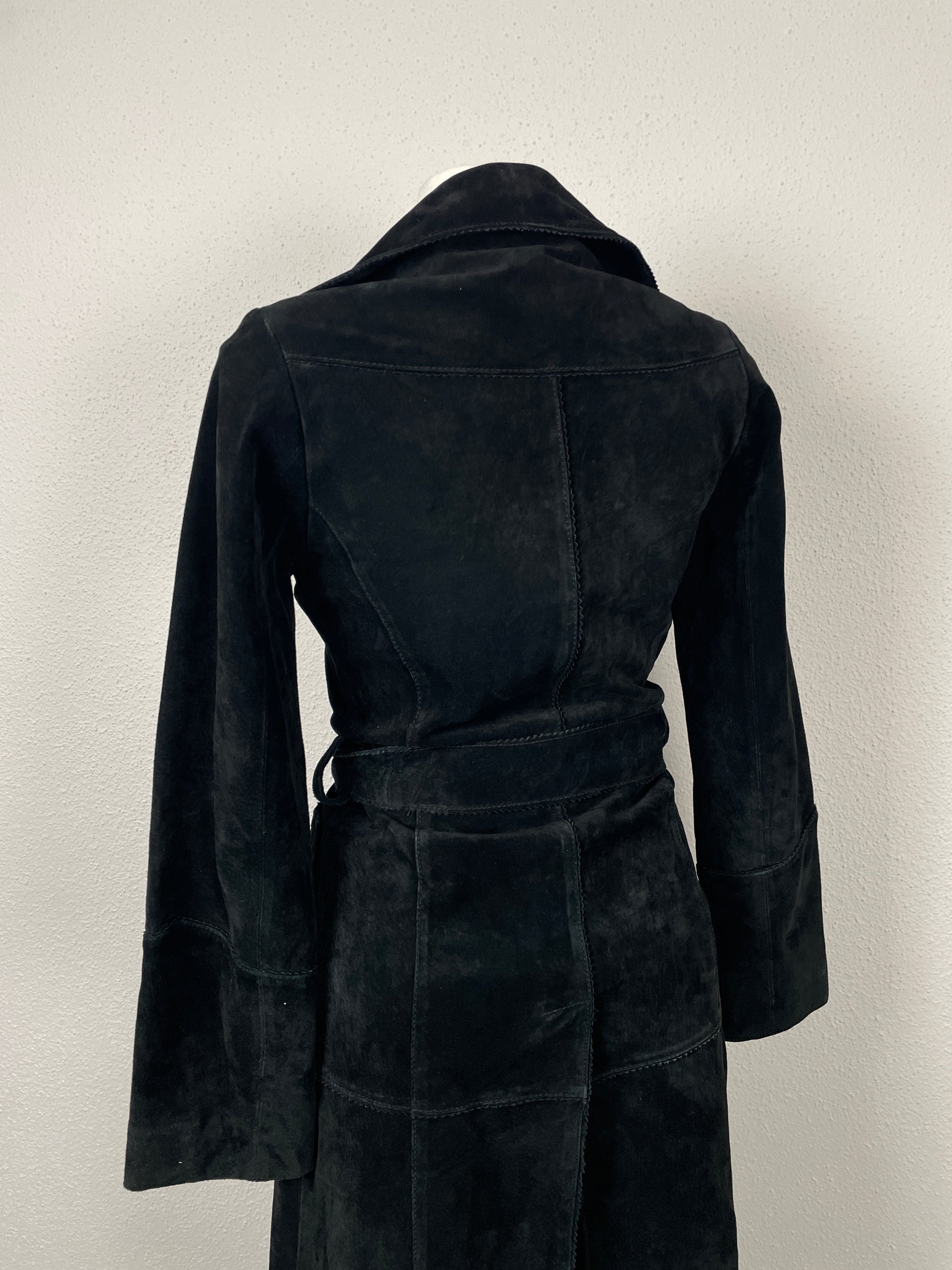 Vintage Y2K 2000s black suede trench coat with a tailored silhouette and belt at the waist. Features a pointed collar, button front closure, and structured panels for a flattering fit. Soft genuine suede with a matte finish — timeless vintage style.