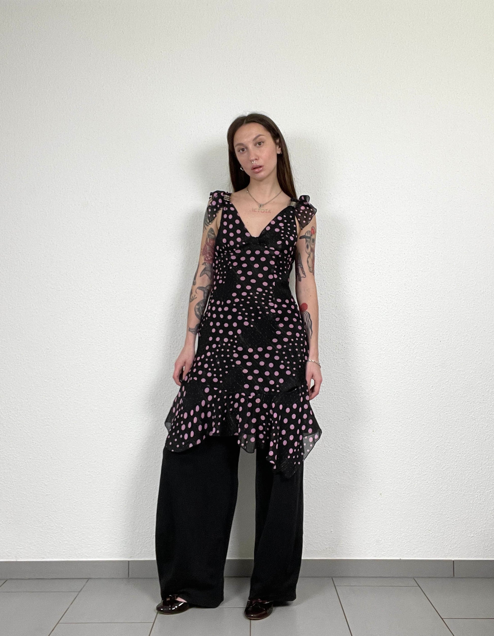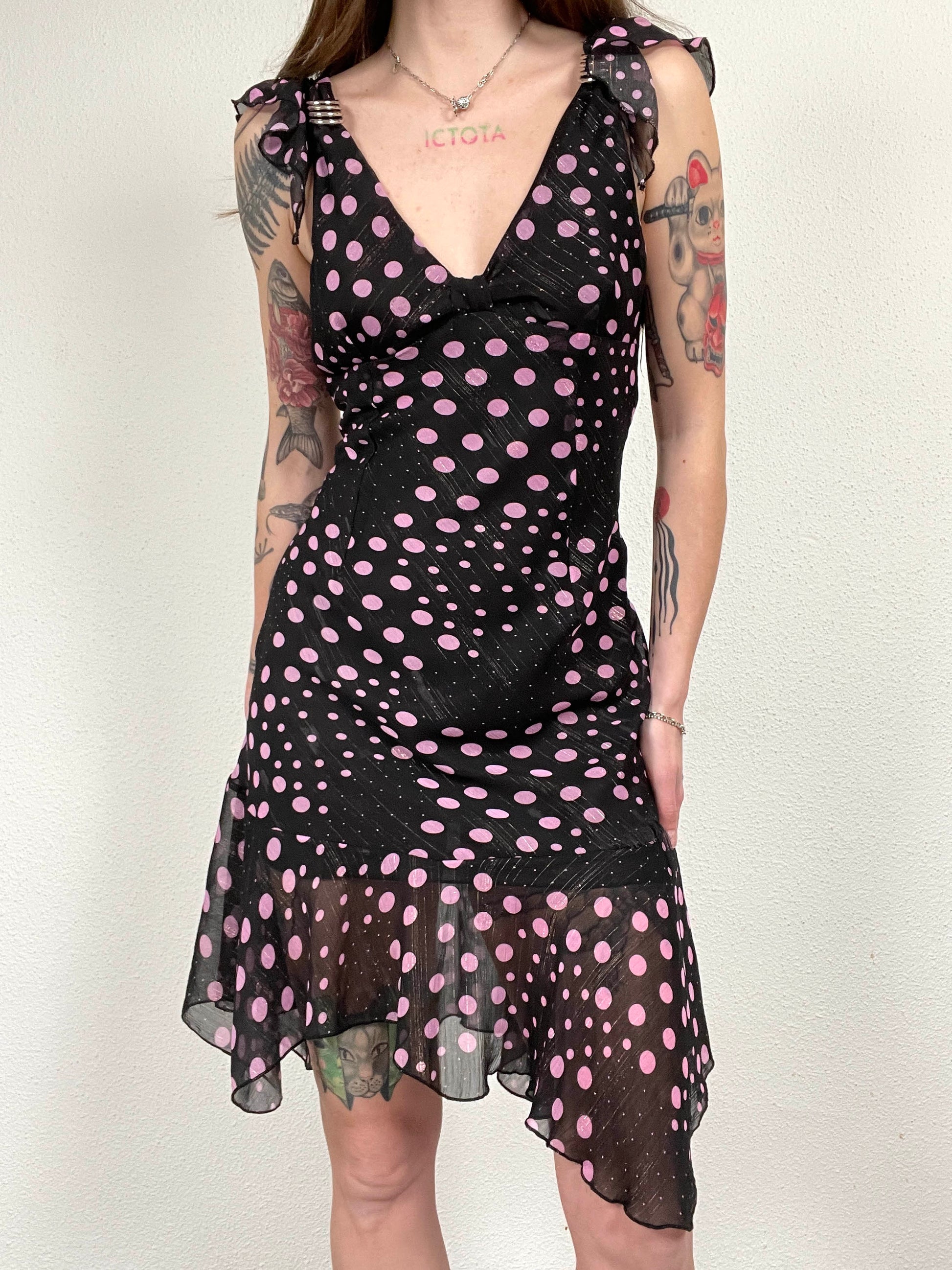 This vintage Y2K dress in black with pink polka dots is a playful throwback to the early 2000s. It features adjustable ruffle straps and a feminine A-line silhouette, making it both fun and flattering for any casual occasion.