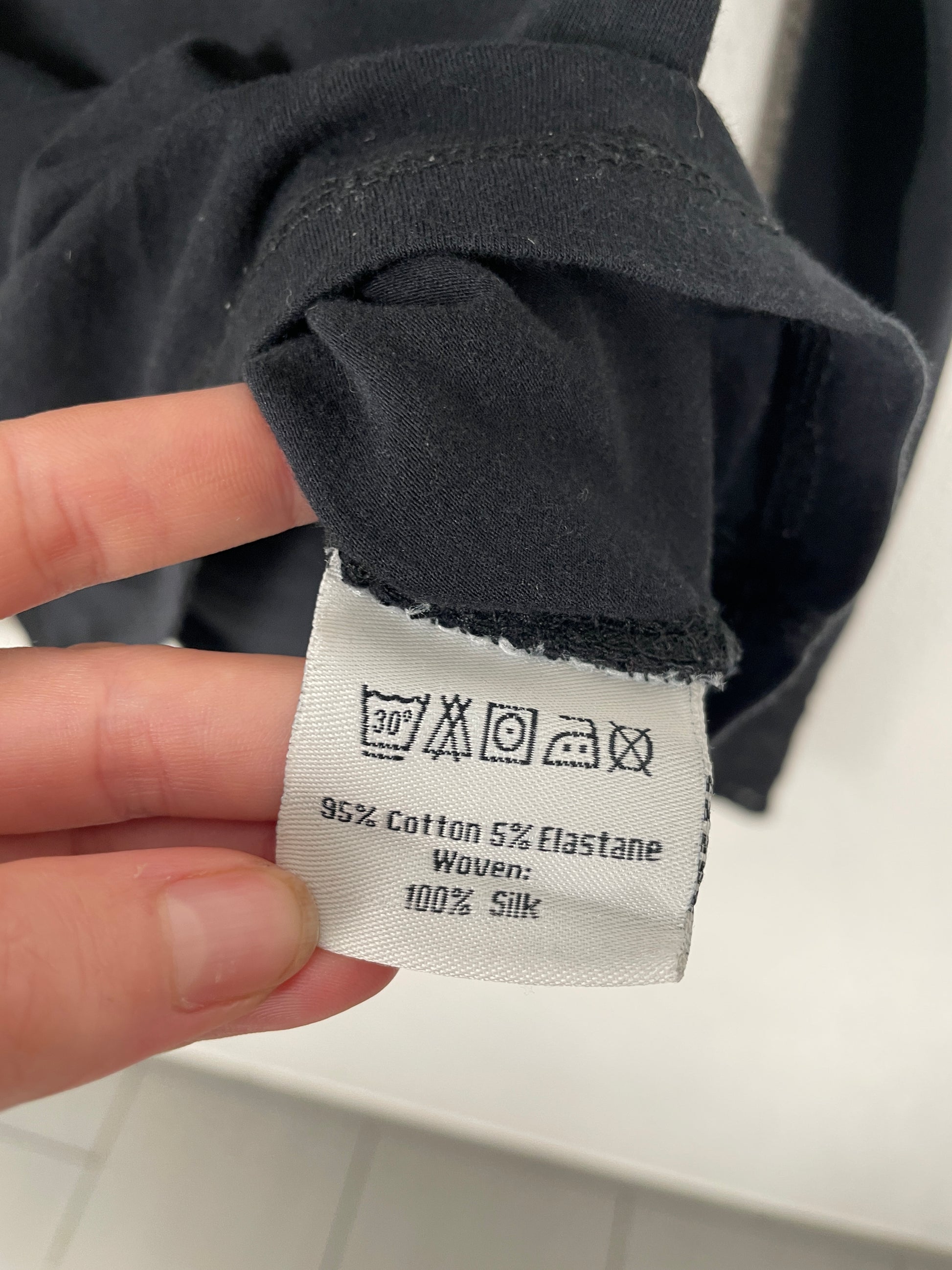 Elegant fitted design with a deep rounded neckline featuring embroidered sheer lace inserts and a small keyhole cut-out. The same delicate lace detail decorates the sleeve cuffs, adding a refined romantic touch. Crafted from a soft cotton-elastane blend with silk lace — stretchy, breathable, and comfortable to wear. A timeless minimalist piece with subtle Y2K femininity.