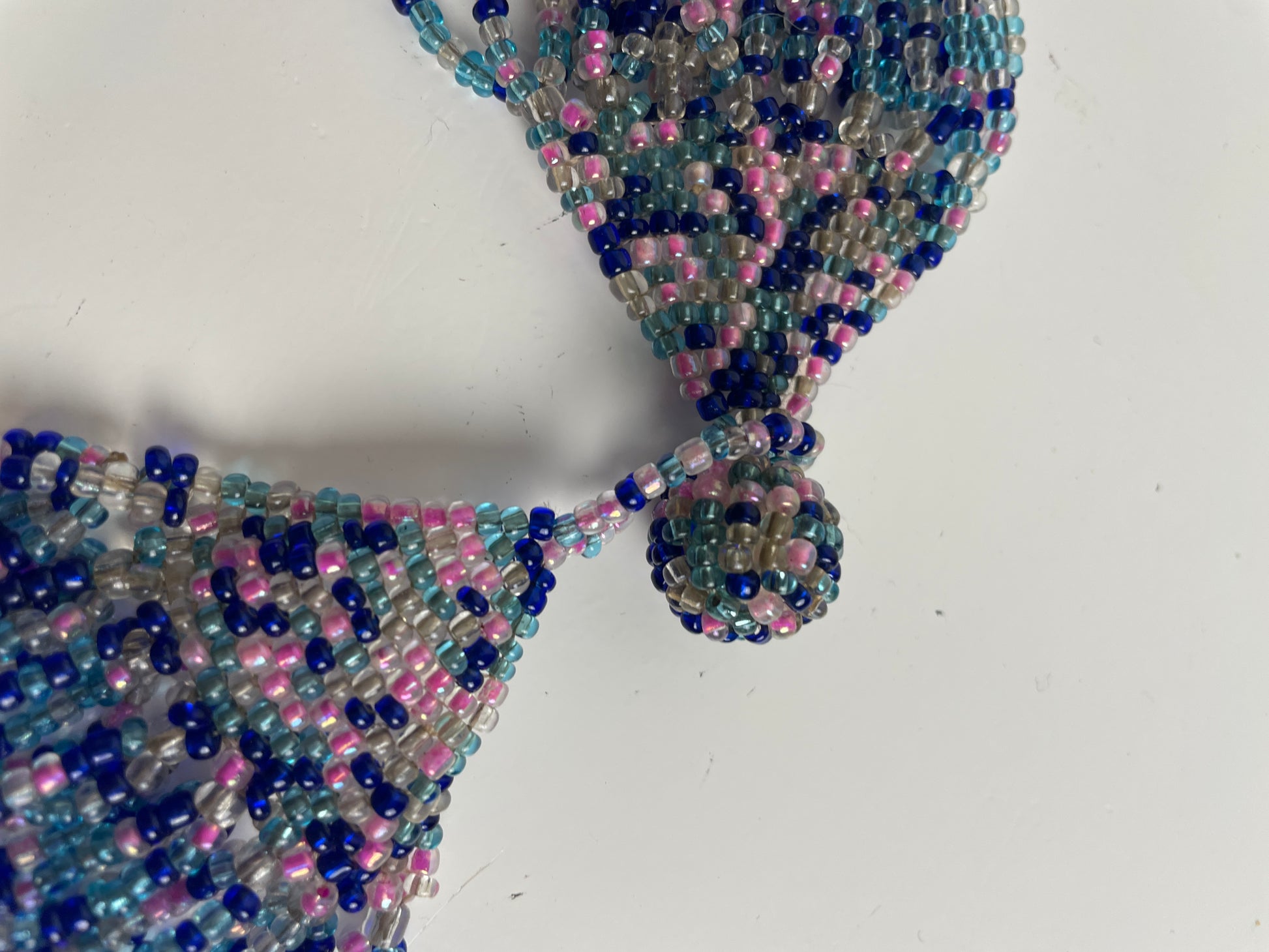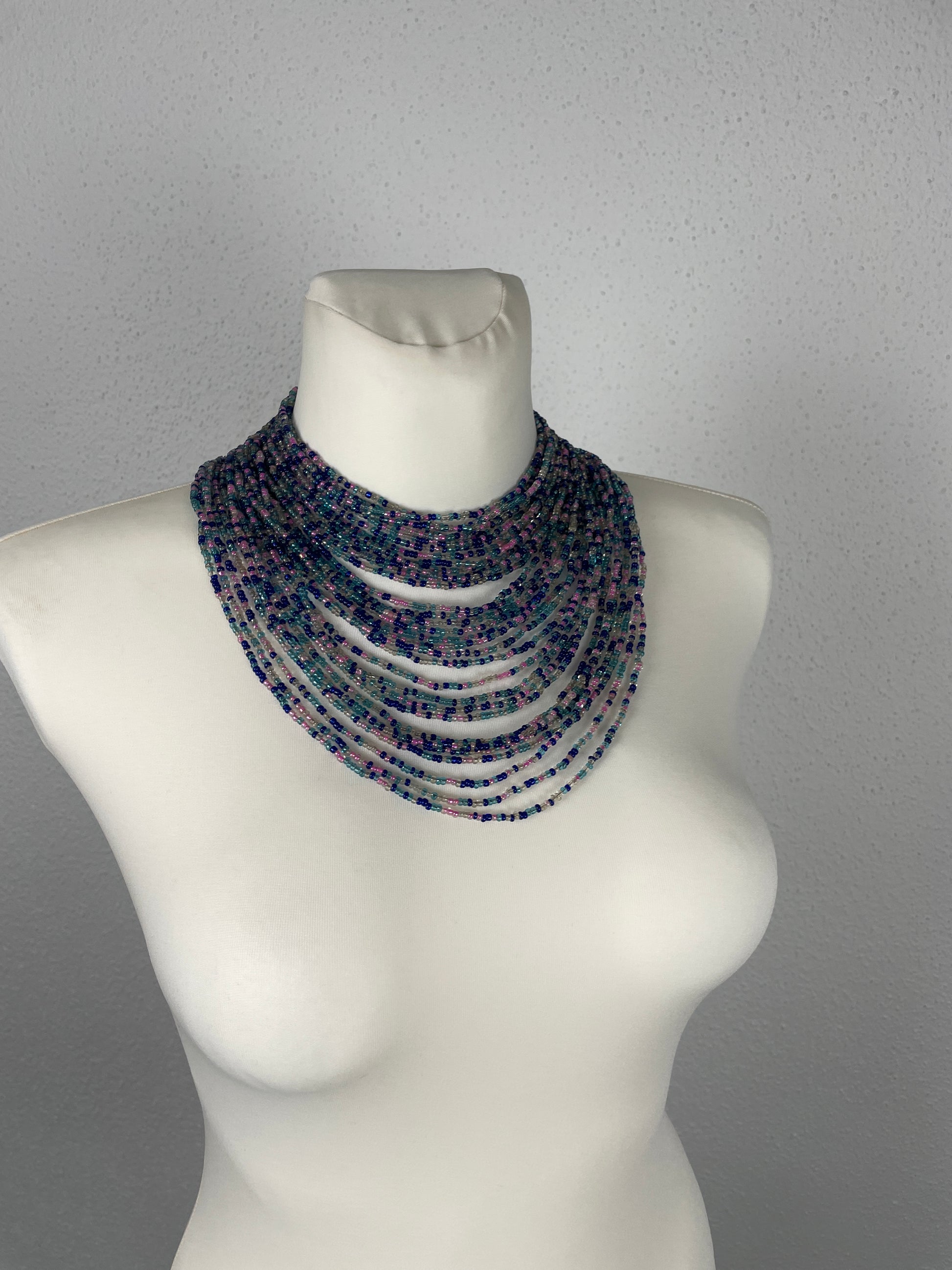 This beautiful vintage necklace from Ukraine is crafted from multiple strands of tiny glass beads in shades of purple, pink, blue, and green. The layered design creates a bold statement piece that adds texture and color to any outfit. A unique handmade accessory with authentic vintage charm.