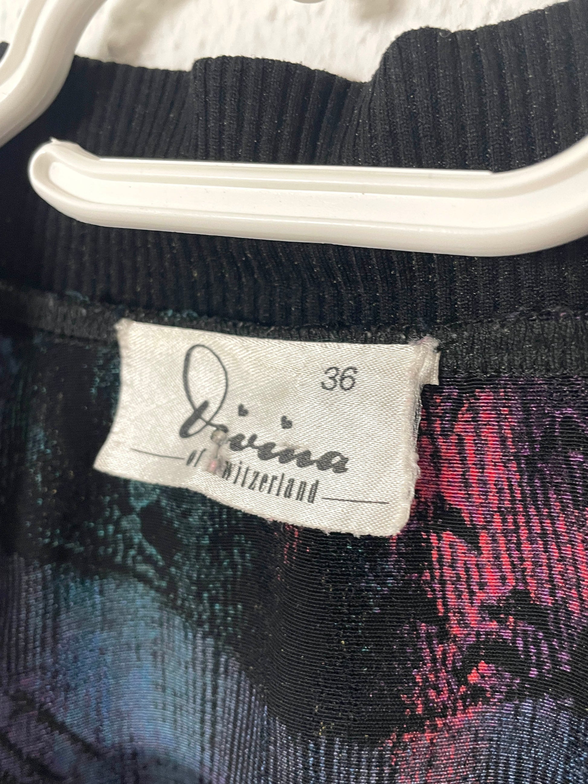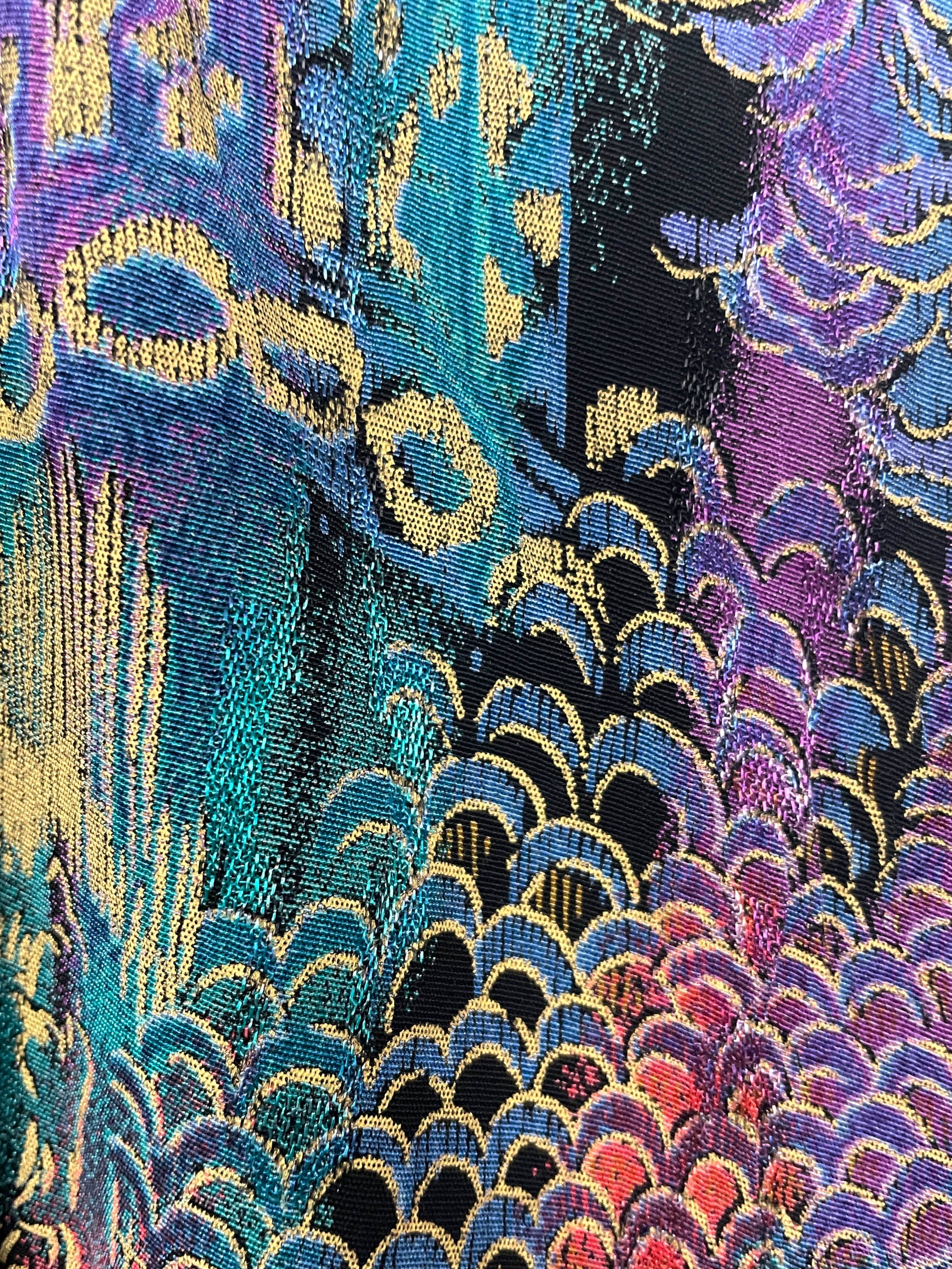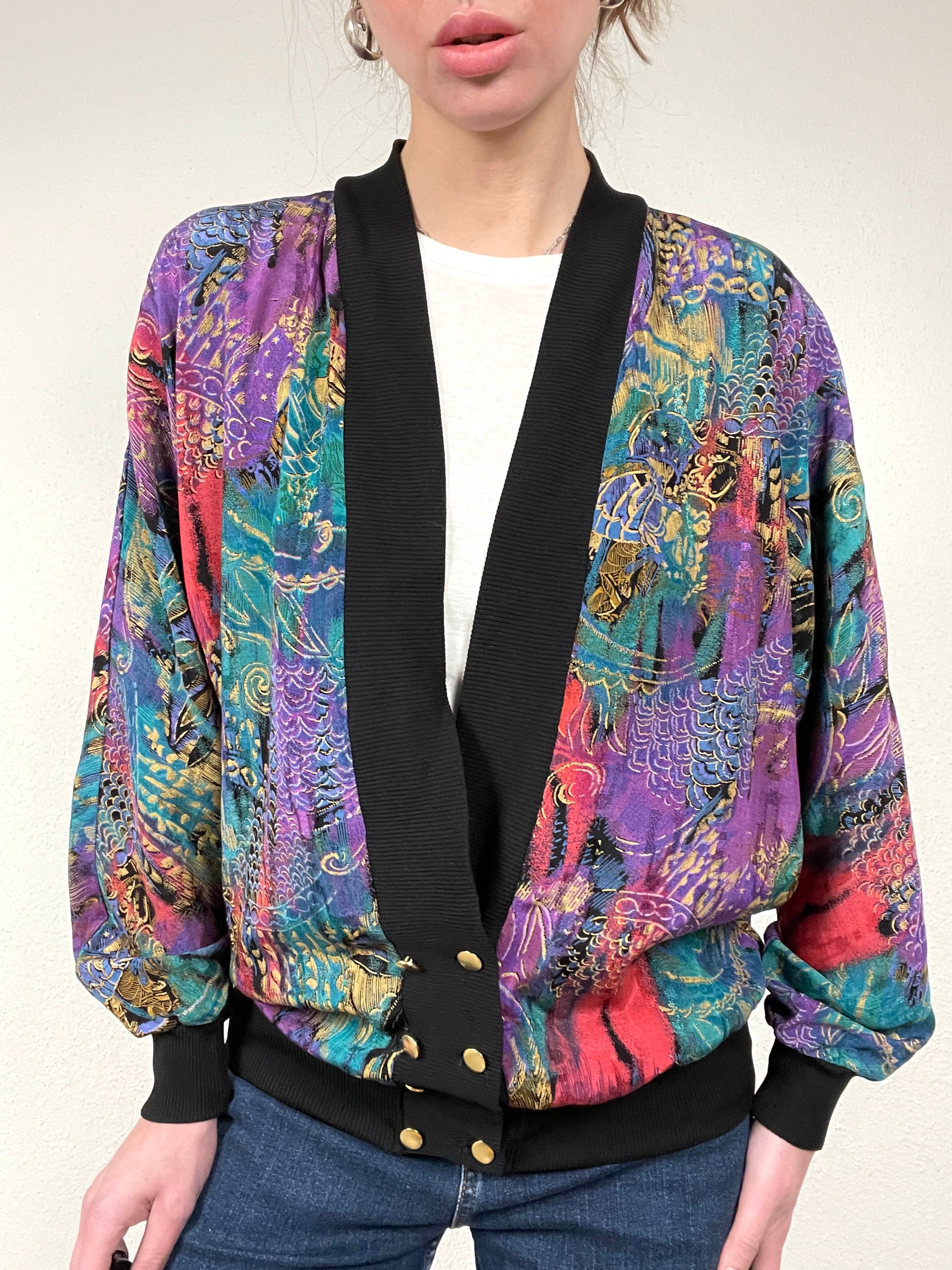 This colorful 90s jacket from Vivienne of Switzerland features a bold print and dropped shoulders for a relaxed, retro style.