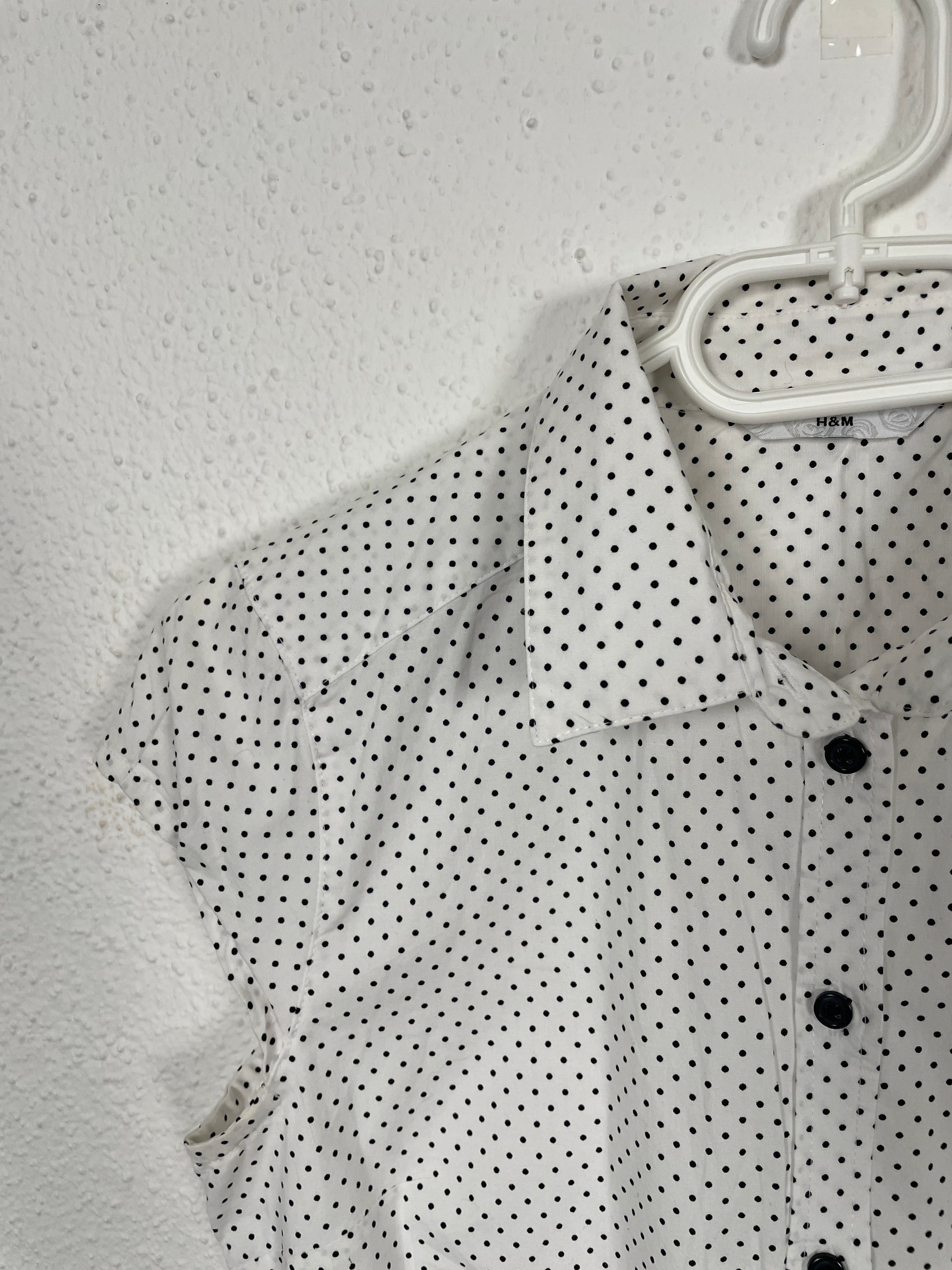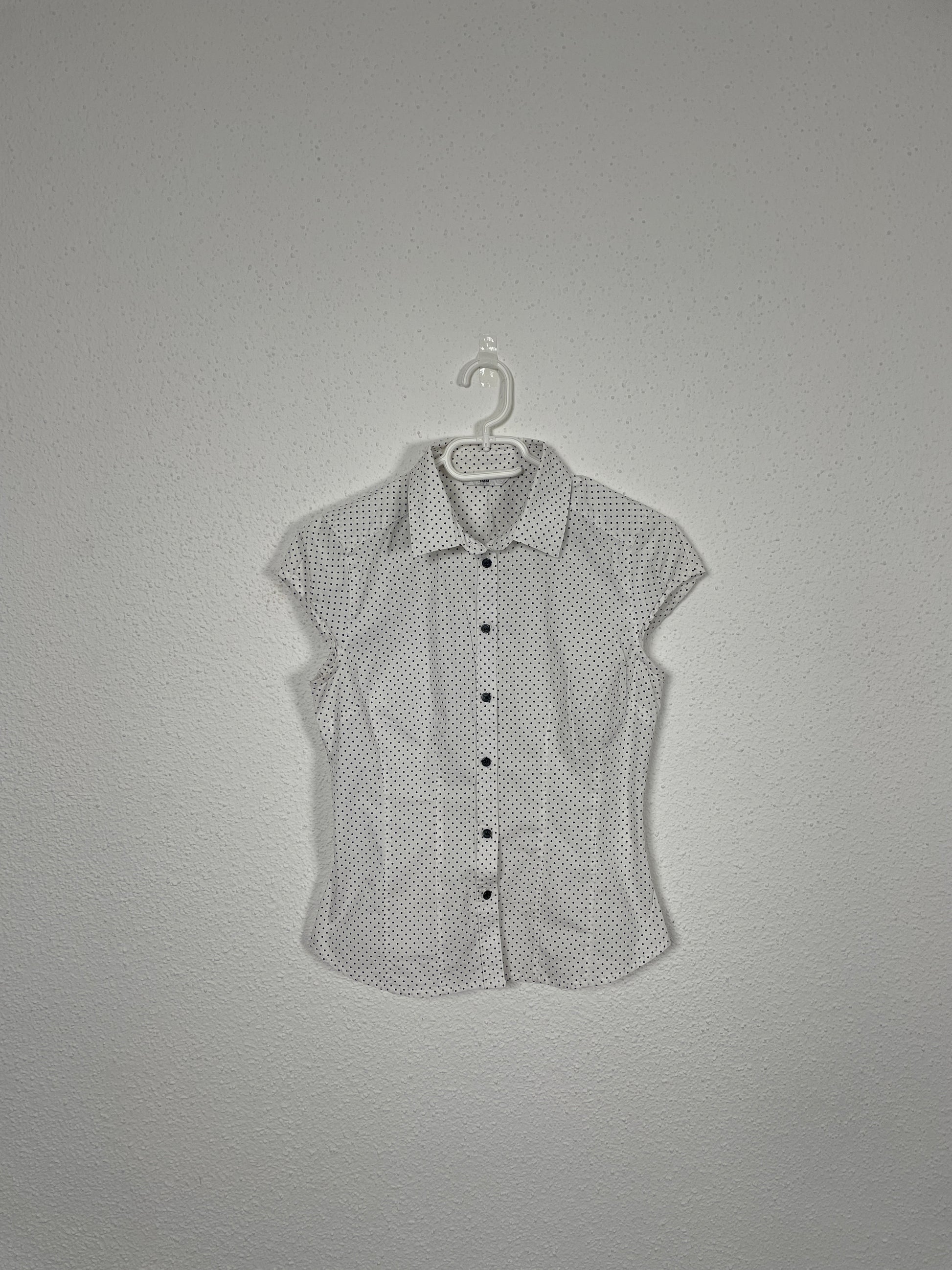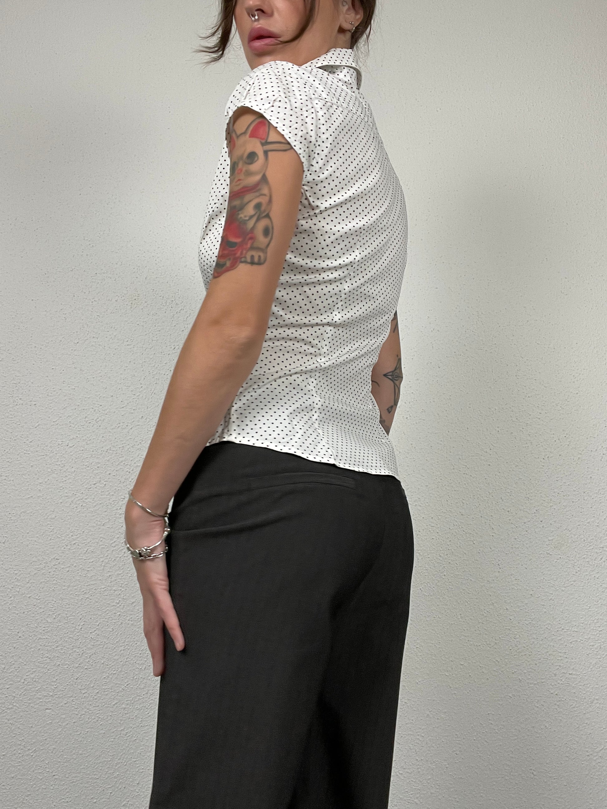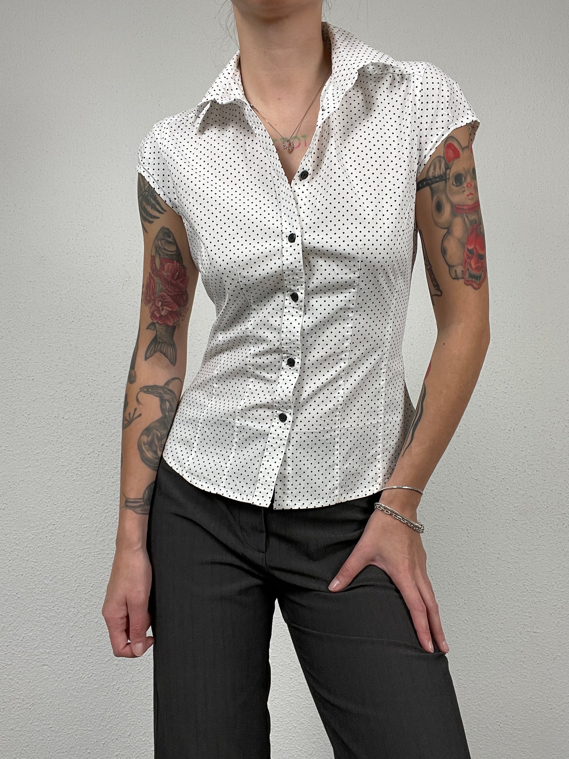 Classic Y2K fitted shirt in crisp white cotton with a delicate black polka dot print. Features a short cap sleeve, pointed collar, and tailored seams that accentuate the waist. A versatile piece that pairs perfectly with low-rise trousers or denim for a clean early-2000s look.