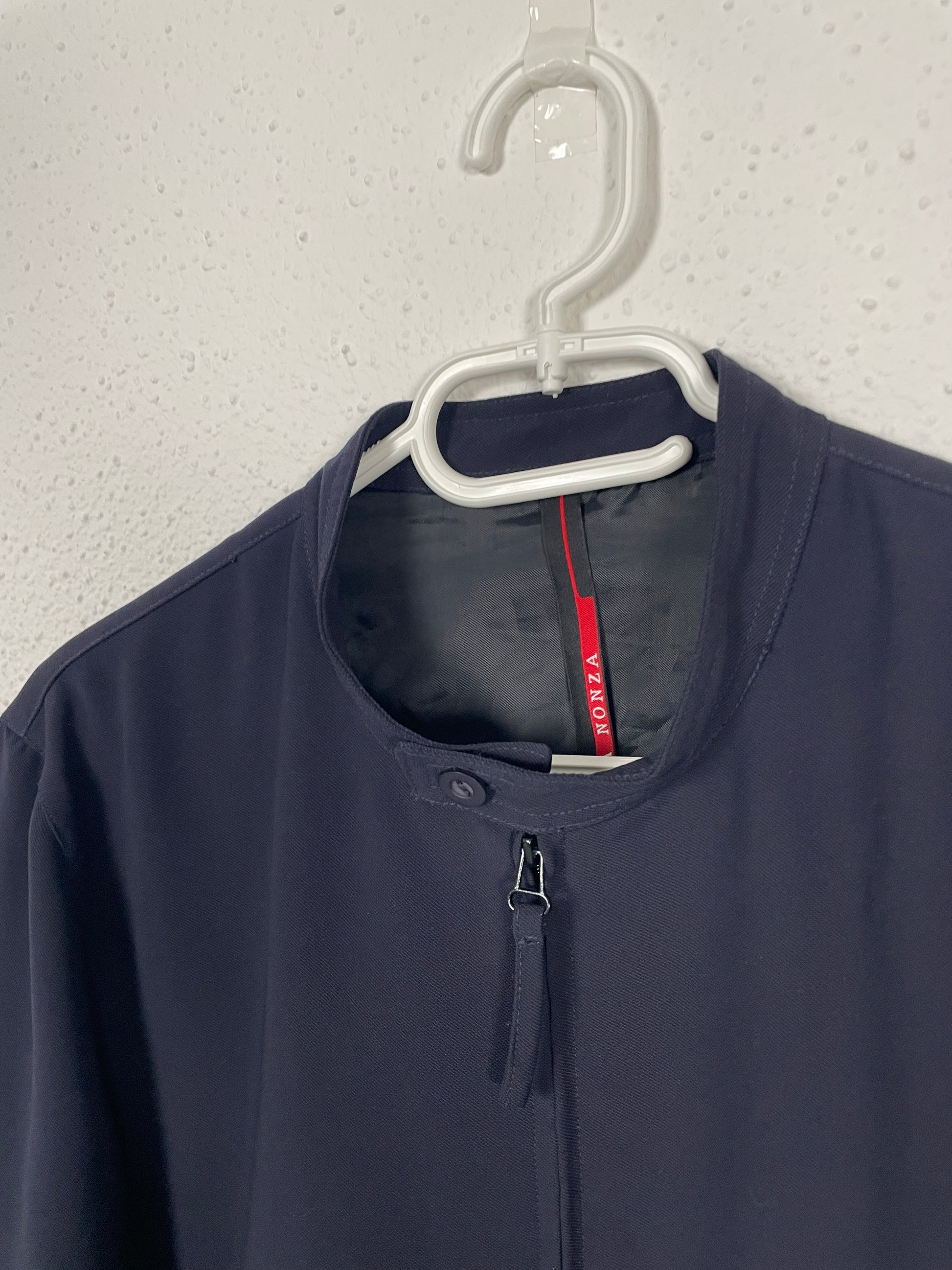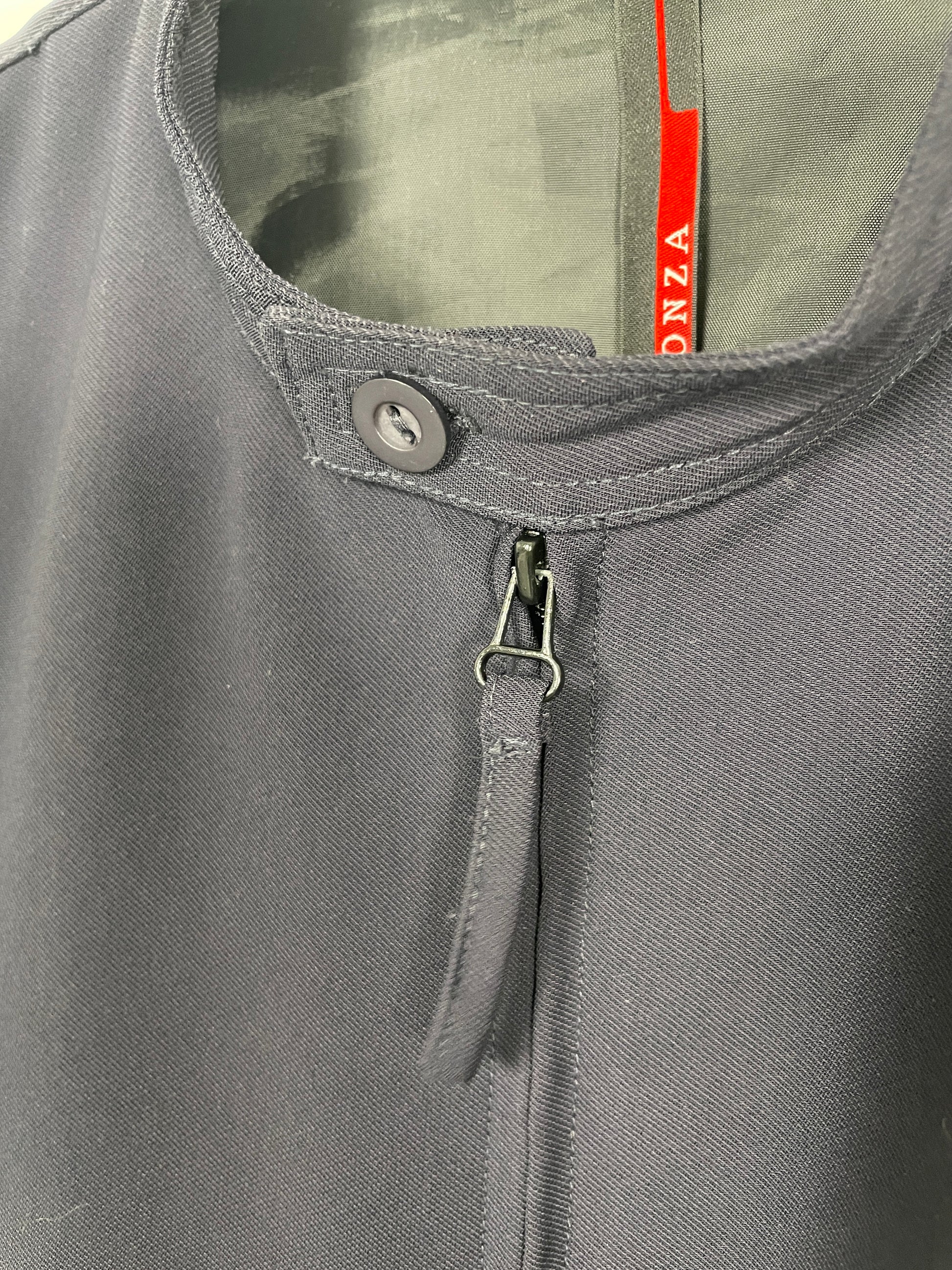 Early 2000s navy zip-up cropped jacket by Ana Nonza. Features a minimalist design with a short stand collar, hidden zip closure, and adjustable strap detail at the hem and cuffs. Slightly structured fit with clean lines — a sleek Y2K-inspired piece in smooth woven polyester.