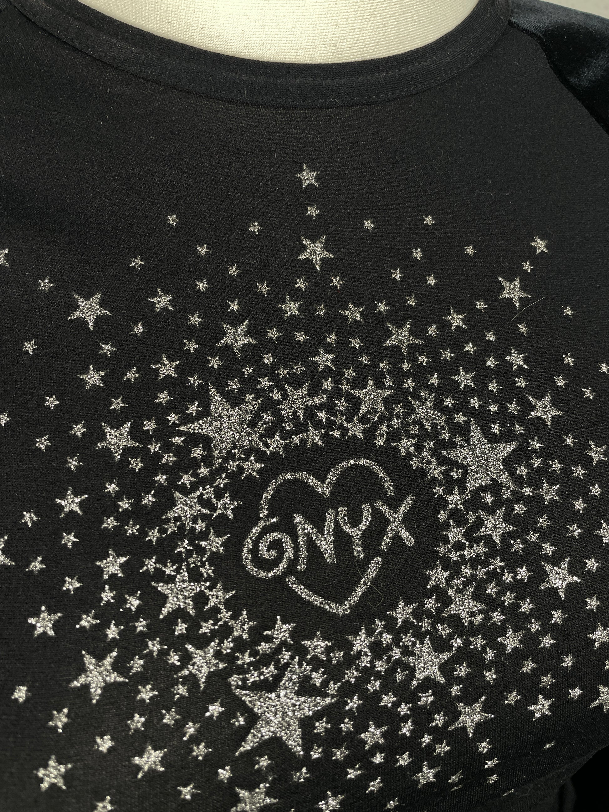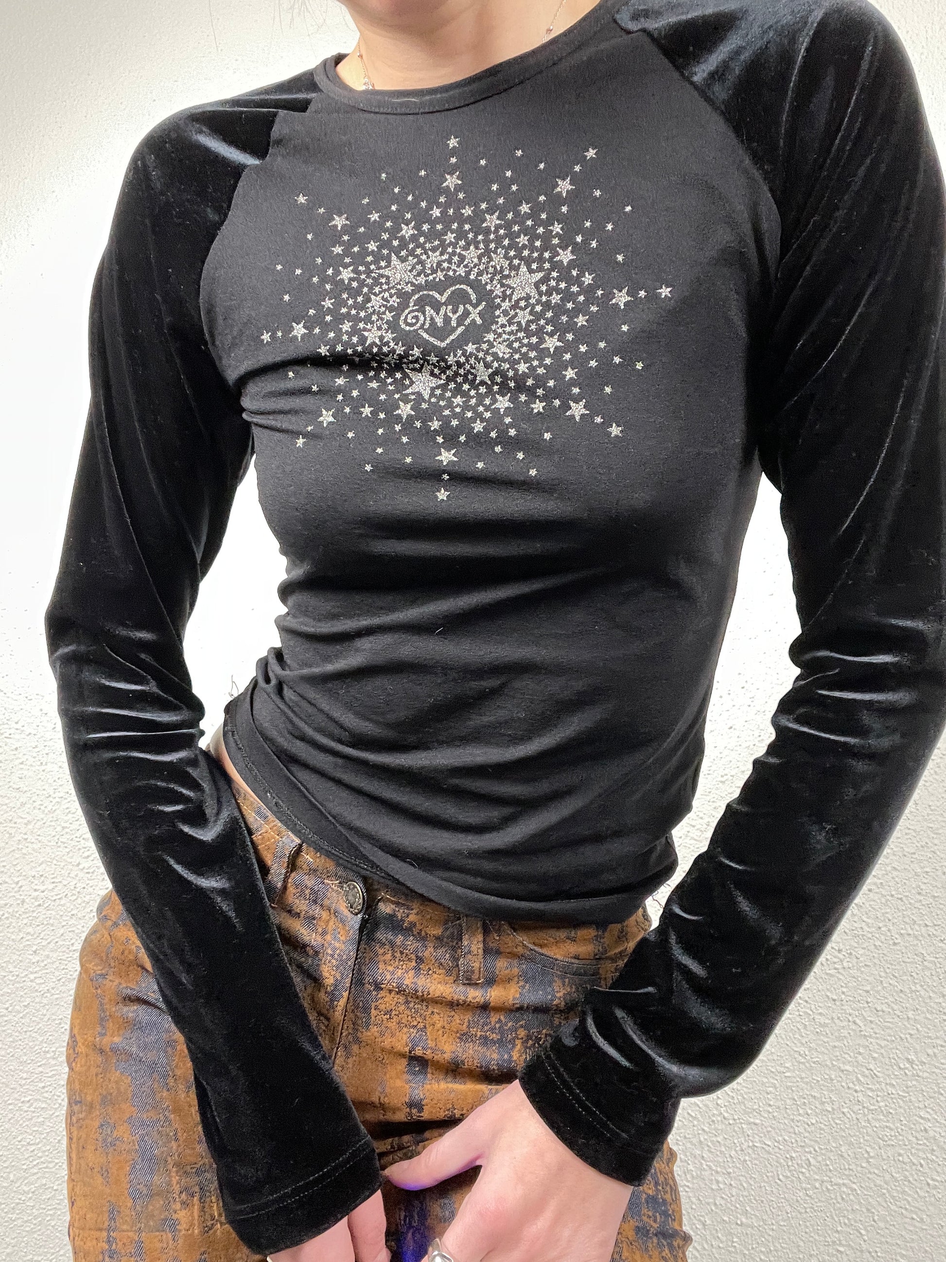 Y2K vintage ONYX Italian velvet-sleeve starburst top.
